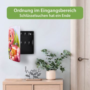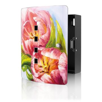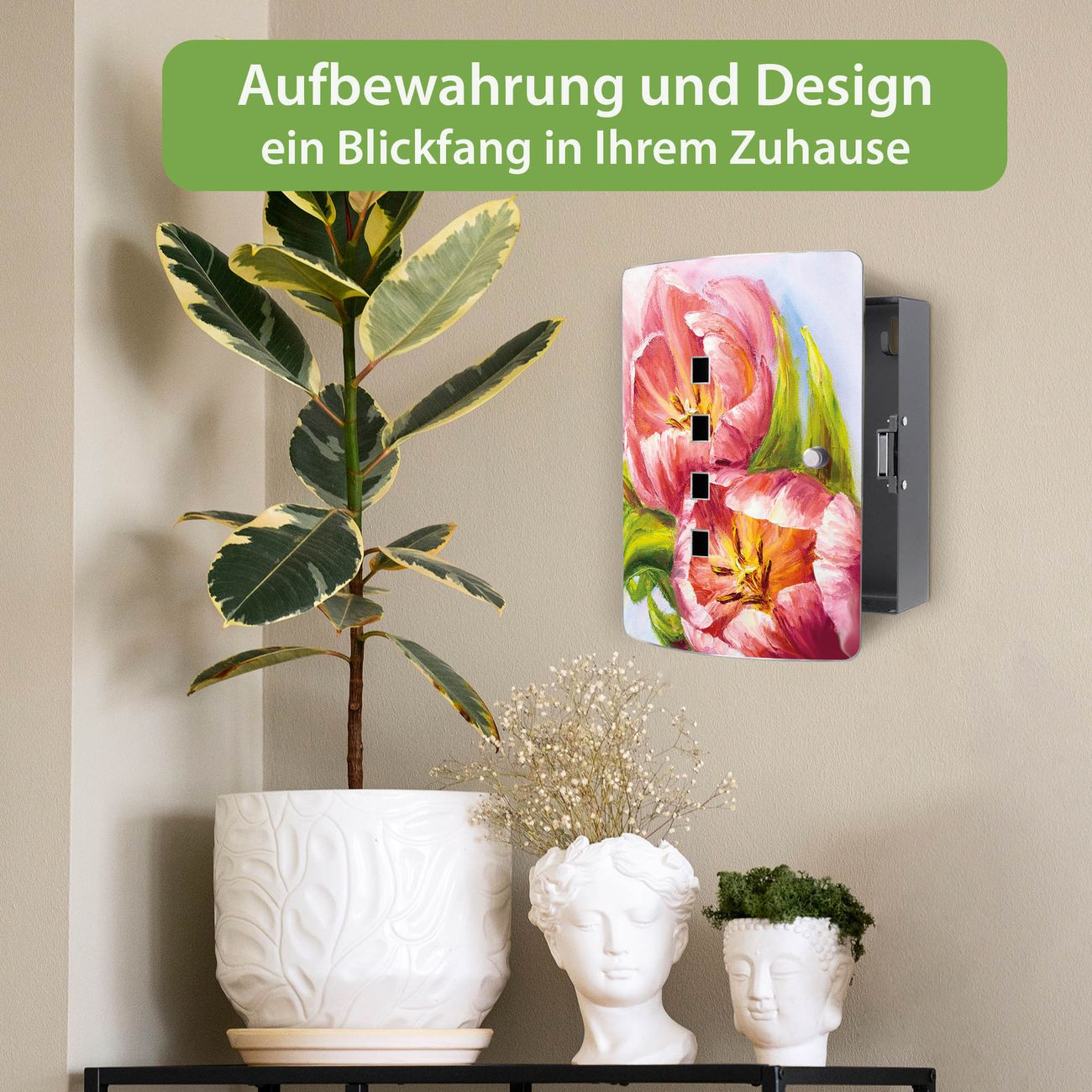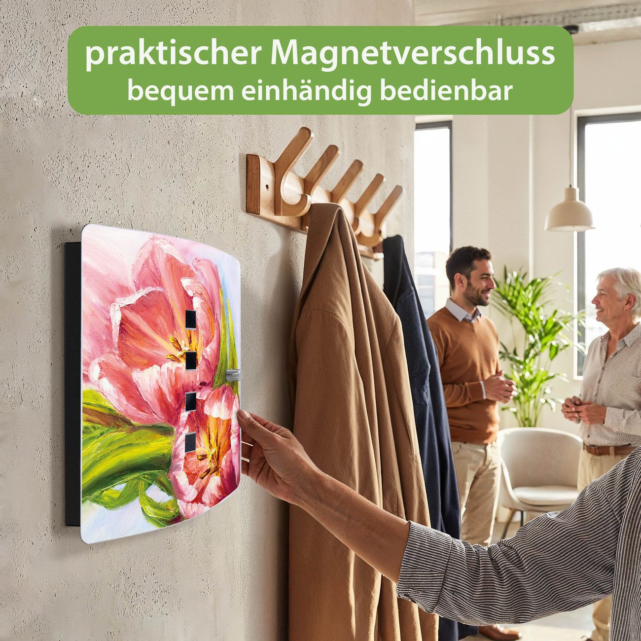 Funktion / Nutzen: Die leicht geschwungene Edelstahltür ist mit einer hochwertigen Motivfolie und dem Motiv Motiv Tulpen Detail kaschiert. Ein praktischer Magnetverschluss ermöglicht Ihnen ein schnelles Öffnen und Schließen. Befestigt wird der Schlüsselkasten an 2 Stellen auf der Rückseite, passendes Montagematerial fügen wir bereits bei.