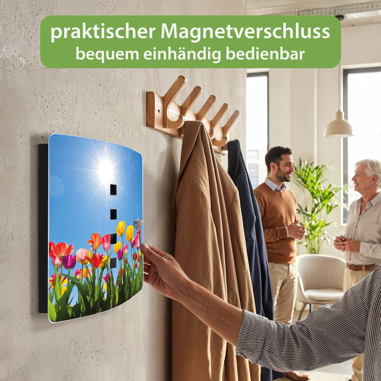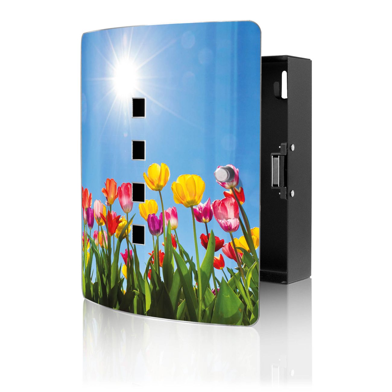Funktion / Nutzen: Die leicht geschwungene Edelstahltür ist mit einer hochwertigen Motivfolie und dem Motiv Motiv Tulpenmeer kaschiert. Ein praktischer Magnetverschluss ermöglicht Ihnen ein schnelles Öffnen und Schließen. Befestigt wird der Schlüsselkasten an 2 Stellen auf der Rückseite, passendes Montagematerial fügen wir bereits bei.