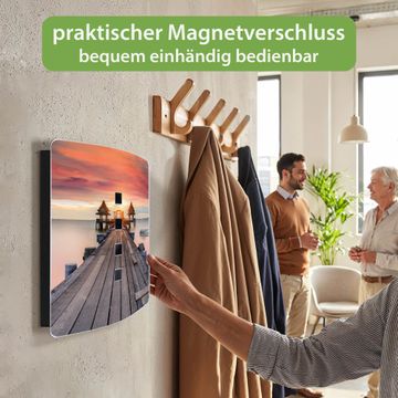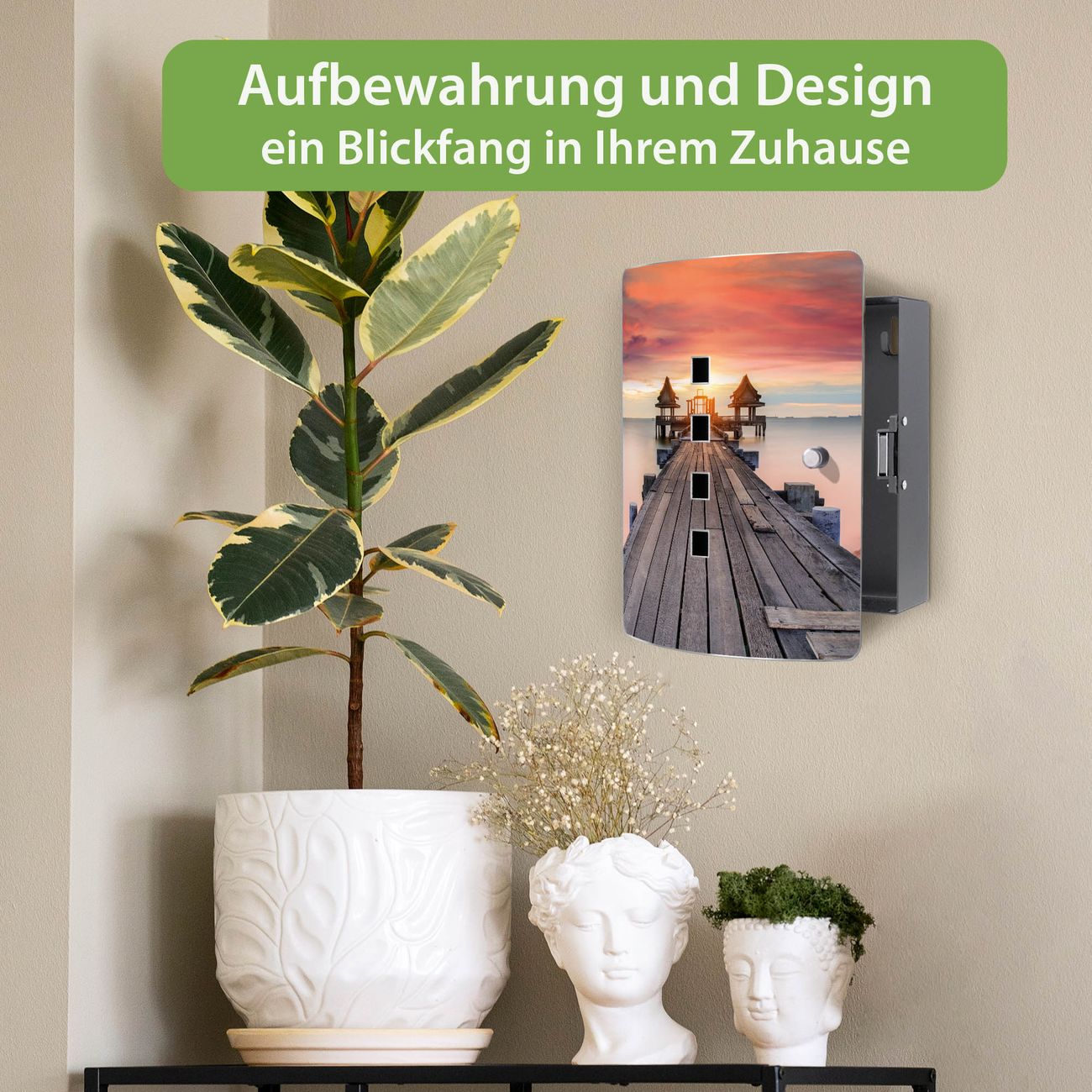Funktion / Nutzen: Die leicht geschwungene Edelstahltür ist mit einer hochwertigen Motivfolie und dem Motiv Motiv Überm Nebelmeer kaschiert. Ein praktischer Magnetverschluss ermöglicht Ihnen ein schnelles Öffnen und Schließen. Befestigt wird der Schlüsselkasten an 2 Stellen auf der Rückseite, passendes Montagematerial fügen wir bereits bei.