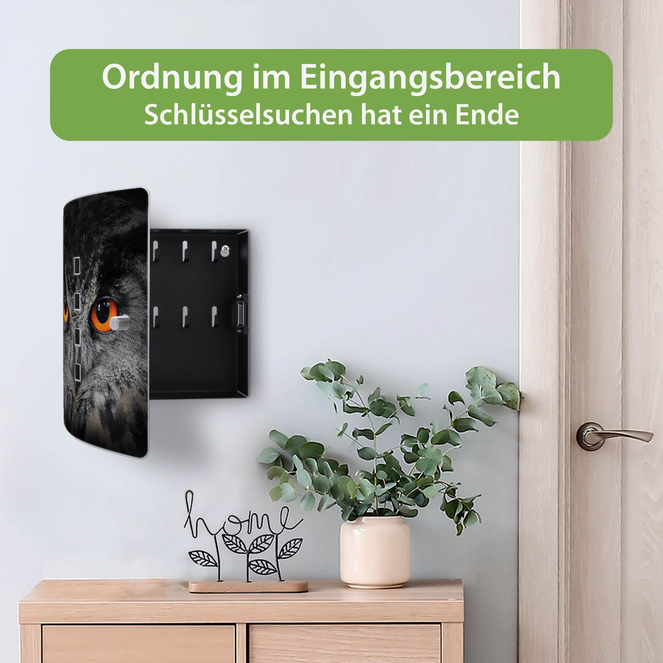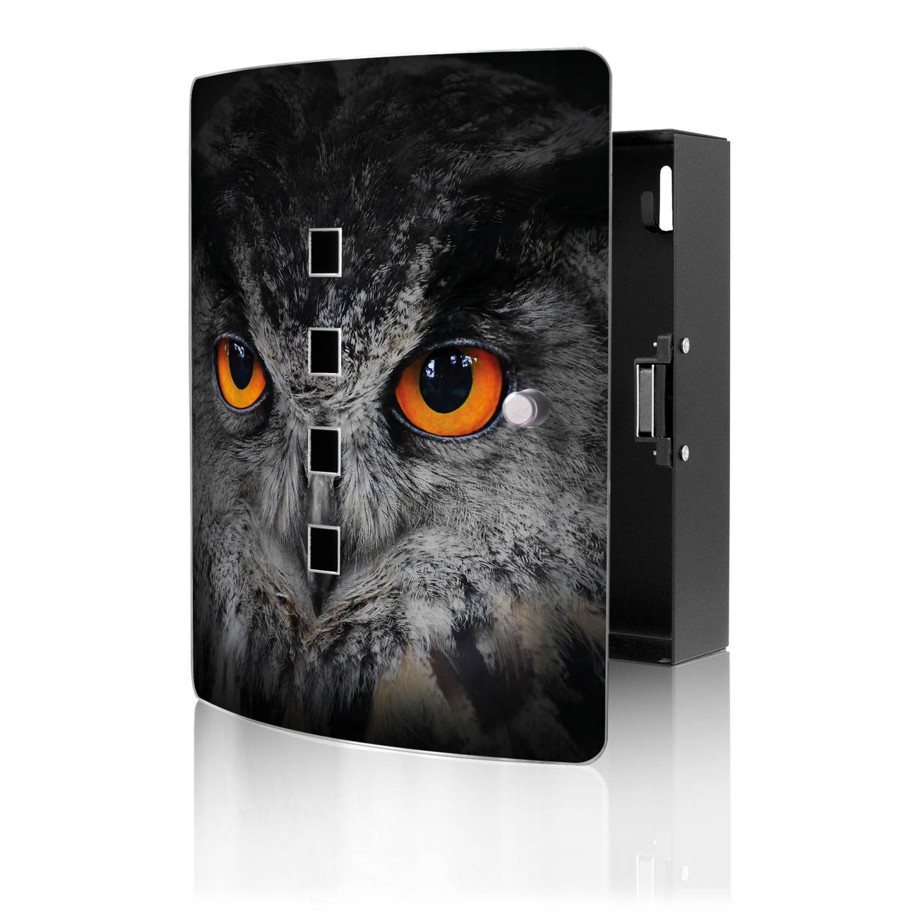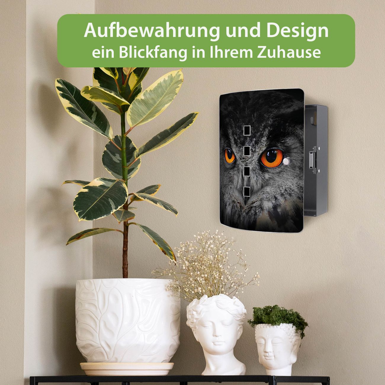 Funktion / Nutzen: Die leicht geschwungene Edelstahltür ist mit einer hochwertigen Motivfolie und dem Motiv Motiv Uhu kaschiert. Ein praktischer Magnetverschluss ermöglicht Ihnen ein schnelles Öffnen und Schließen. Befestigt wird der Schlüsselkasten an 2 Stellen auf der Rückseite, passendes Montagematerial fügen wir bereits bei.