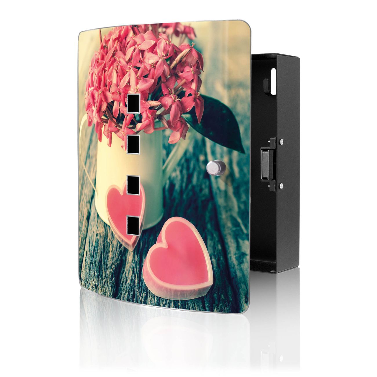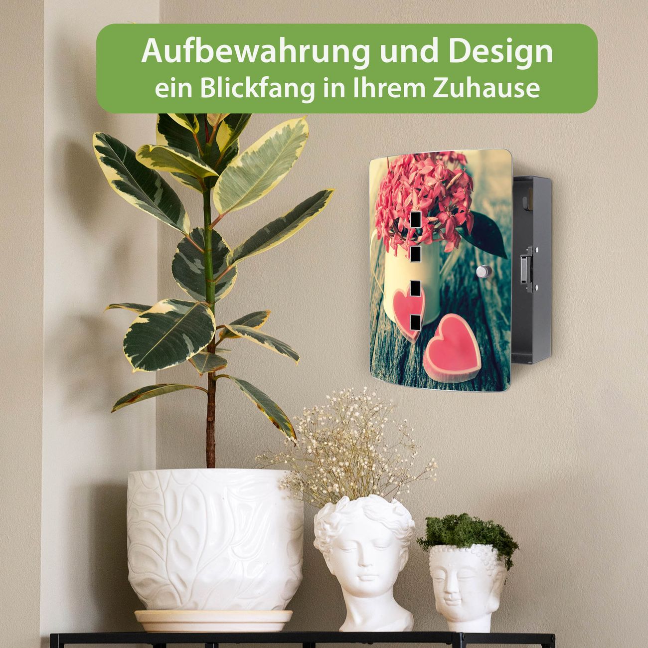Funktion / Nutzen: Die leicht geschwungene Edelstahltür ist mit einer hochwertigen Motivfolie und dem Motiv Motiv Valentin kaschiert. Ein praktischer Magnetverschluss ermöglicht Ihnen ein schnelles Öffnen und Schließen. Befestigt wird der Schlüsselkasten an 2 Stellen auf der Rückseite, passendes Montagematerial fügen wir bereits bei.