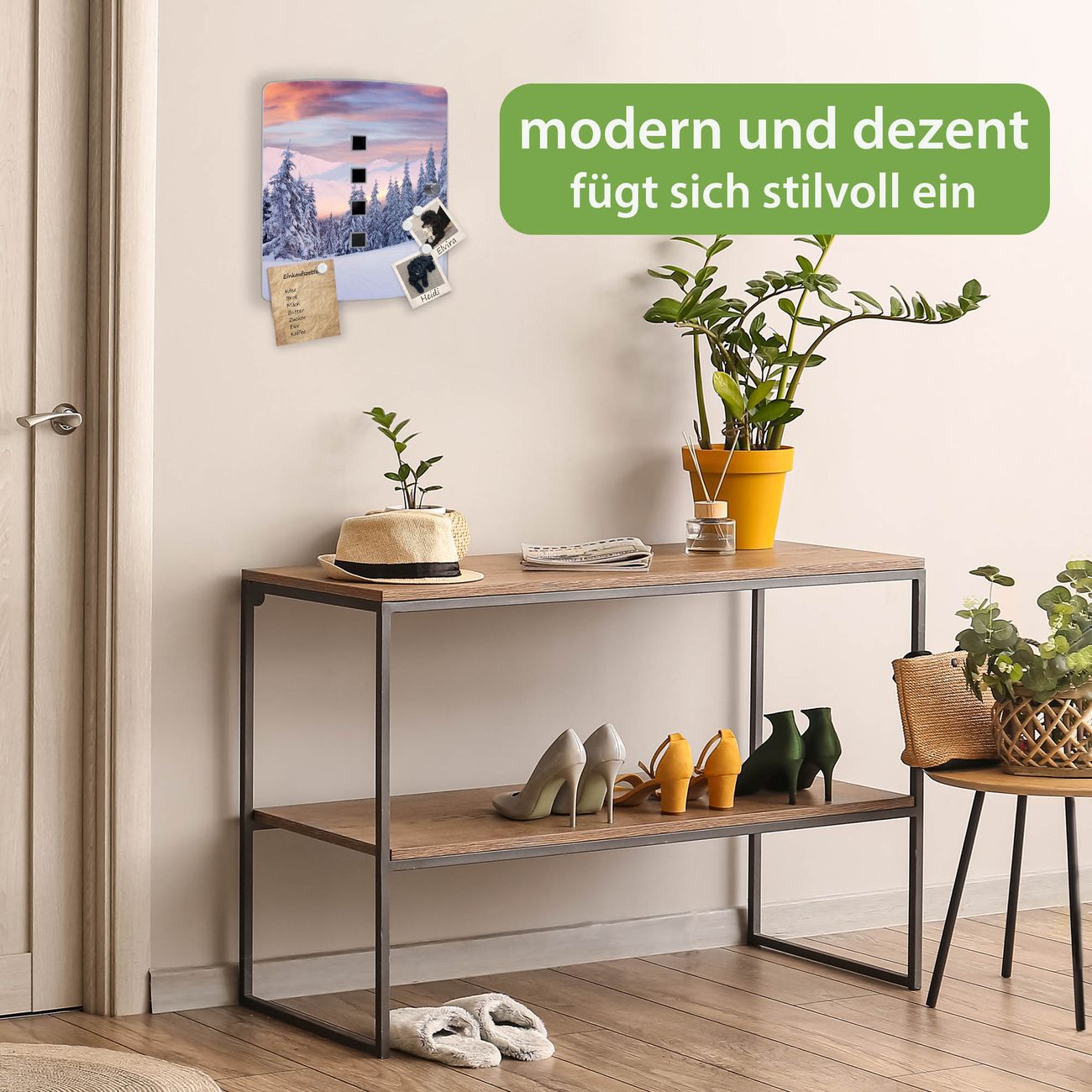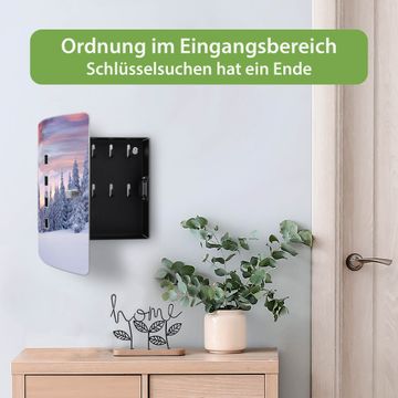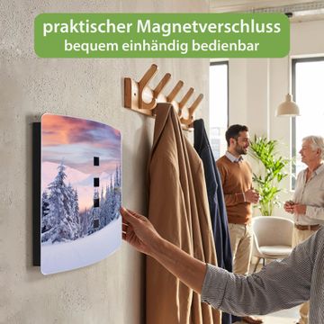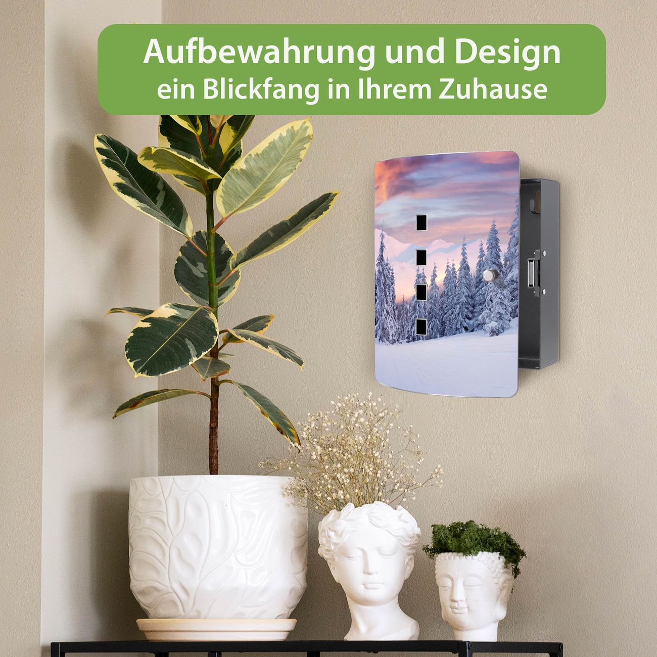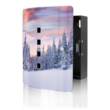 Funktion / Nutzen: Die leicht geschwungene Edelstahltür ist mit einer hochwertigen Motivfolie und dem Motiv Motiv Verschneite Berge kaschiert. Ein praktischer Magnetverschluss ermöglicht Ihnen ein schnelles Öffnen und Schließen. Befestigt wird der Schlüsselkasten an 2 Stellen auf der Rückseite, passendes Montagematerial fügen wir bereits bei.