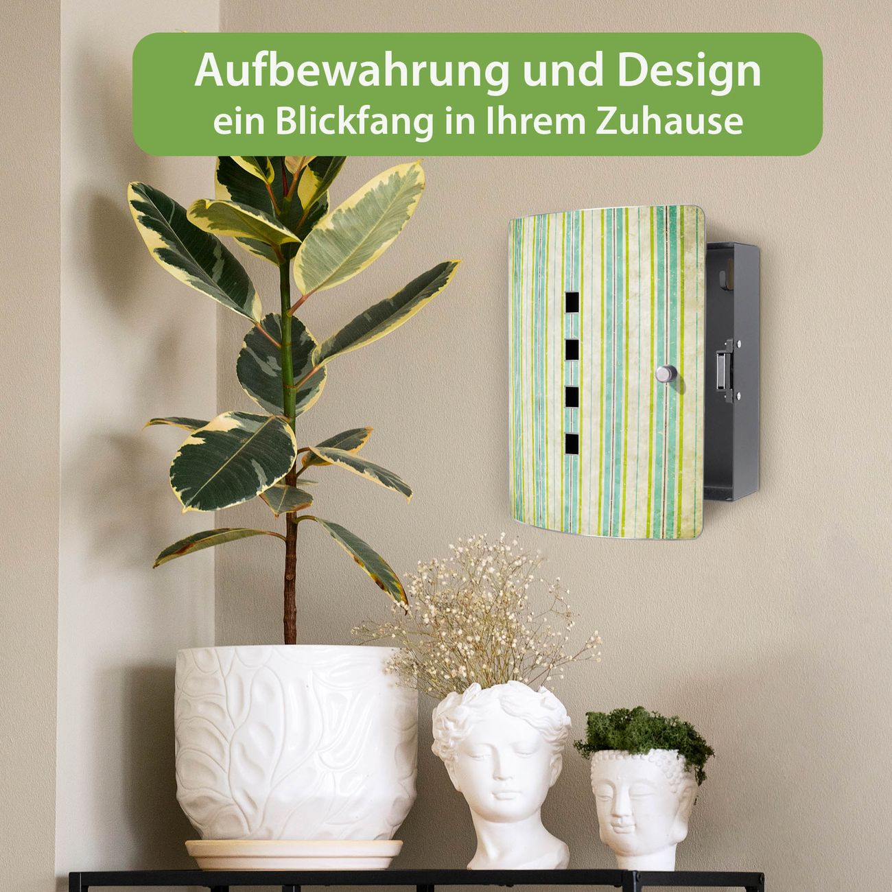 Funktion / Nutzen: Die leicht geschwungene Edelstahltür ist mit einer hochwertigen Motivfolie und dem Motiv Motiv Vintage Streifenmuster kaschiert. Ein praktischer Magnetverschluss ermöglicht Ihnen ein schnelles Öffnen und Schließen. Befestigt wird der Schlüsselkasten an 2 Stellen auf der Rückseite, passendes Montagematerial fügen wir bereits bei.