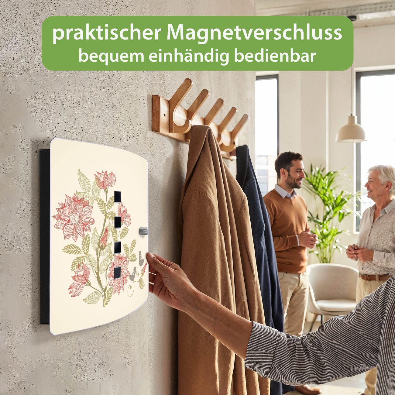Funktion / Nutzen: Die leicht geschwungene Edelstahltür ist mit einer hochwertigen Motivfolie und dem Motiv Motiv Vogelpaar kaschiert. Ein praktischer Magnetverschluss ermöglicht Ihnen ein schnelles Öffnen und Schließen. Befestigt wird der Schlüsselkasten an 2 Stellen auf der Rückseite, passendes Montagematerial fügen wir bereits bei.