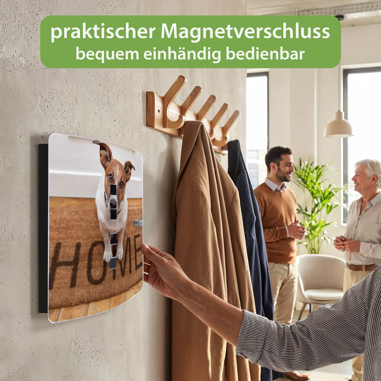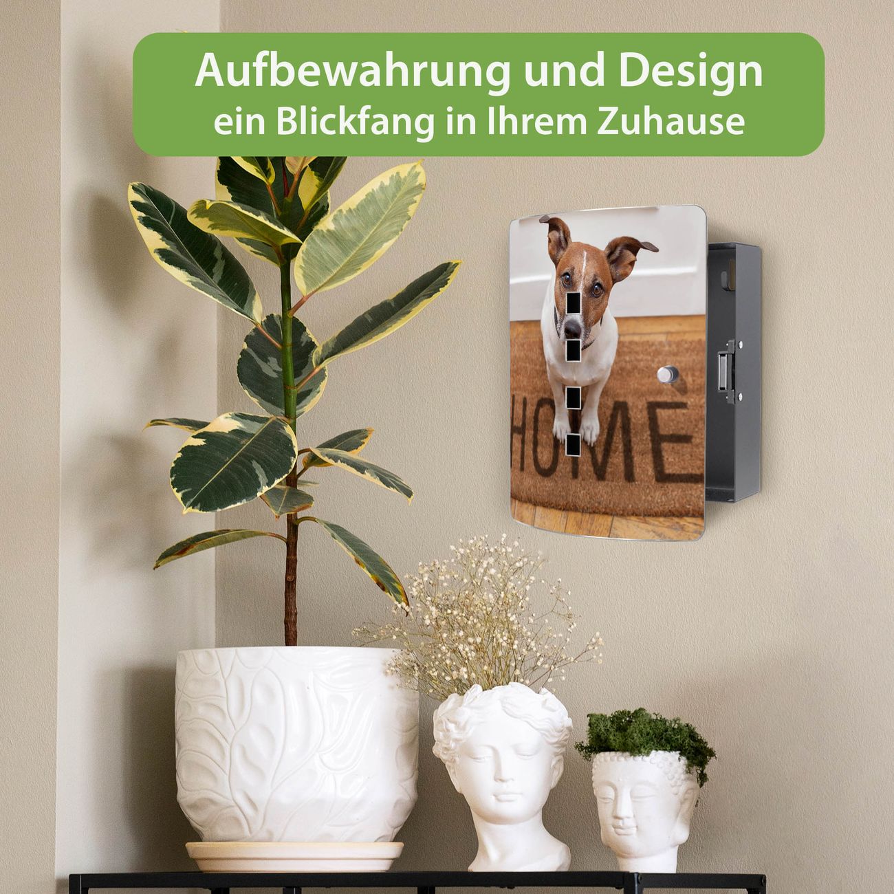 Funktion / Nutzen: Die leicht geschwungene Edelstahltür ist mit einer hochwertigen Motivfolie und dem Motiv Motiv Wachhund Jack Russel kaschiert. Ein praktischer Magnetverschluss ermöglicht Ihnen ein schnelles Öffnen und Schließen. Befestigt wird der Schlüsselkasten an 2 Stellen auf der Rückseite, passendes Montagematerial fügen wir bereits bei.
