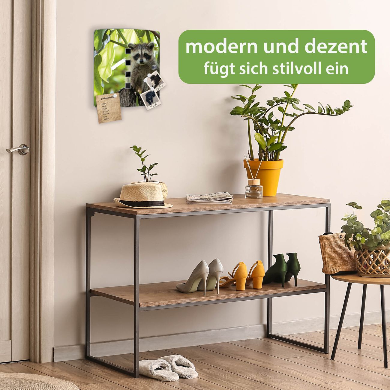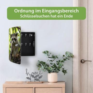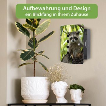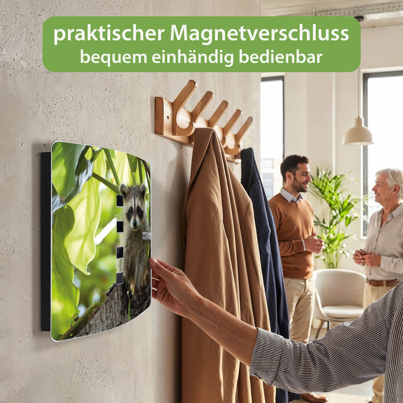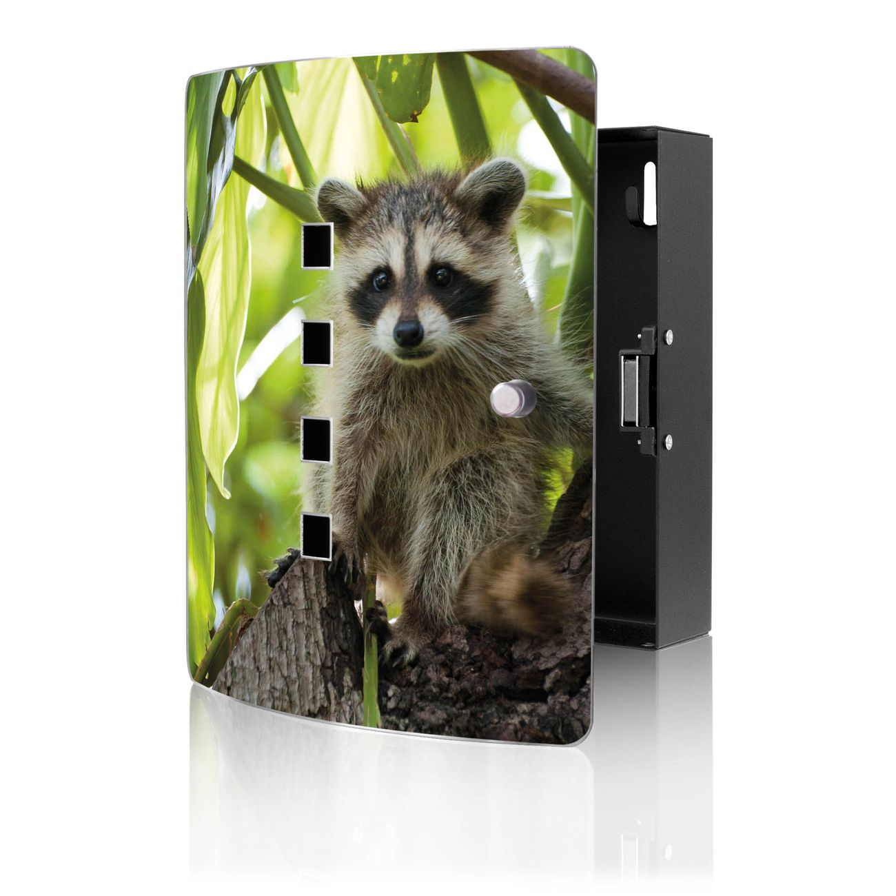 Funktion / Nutzen: Die leicht geschwungene Edelstahltür ist mit einer hochwertigen Motivfolie und dem Motiv Motiv Waschbär kaschiert. Ein praktischer Magnetverschluss ermöglicht Ihnen ein schnelles Öffnen und Schließen. Befestigt wird der Schlüsselkasten an 2 Stellen auf der Rückseite, passendes Montagematerial fügen wir bereits bei.