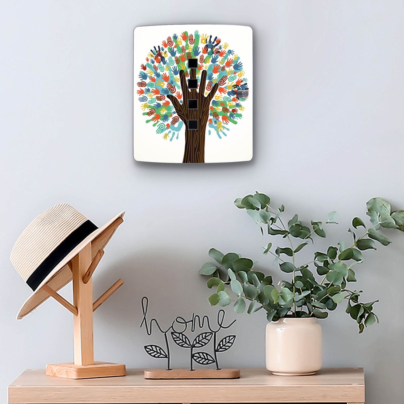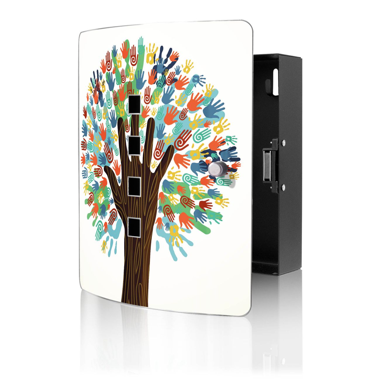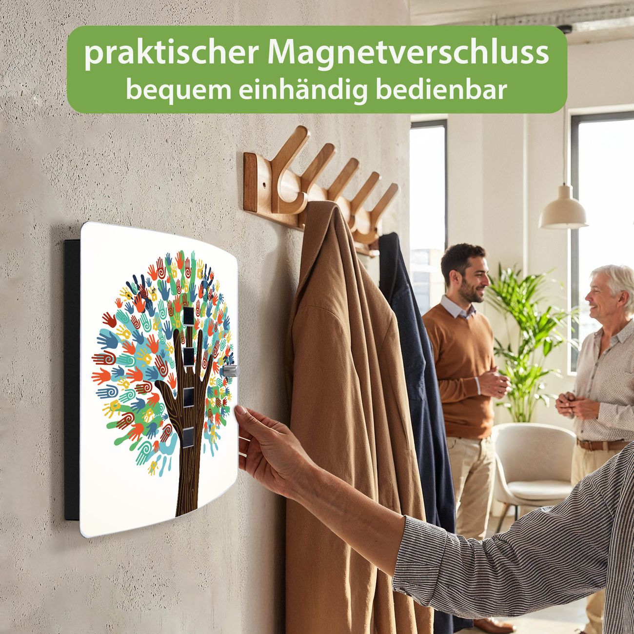 Funktion / Nutzen: Die leicht geschwungene Edelstahltür ist mit einer hochwertigen Motivfolie und dem Motiv Motiv We are the World kaschiert. Ein praktischer Magnetverschluss ermöglicht Ihnen ein schnelles Öffnen und Schließen. Befestigt wird der Schlüsselkasten an 2 Stellen auf der Rückseite, passendes Montagematerial fügen wir bereits bei.