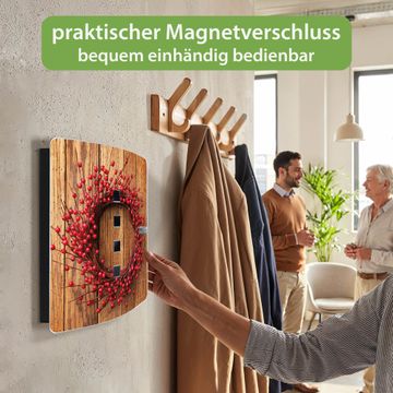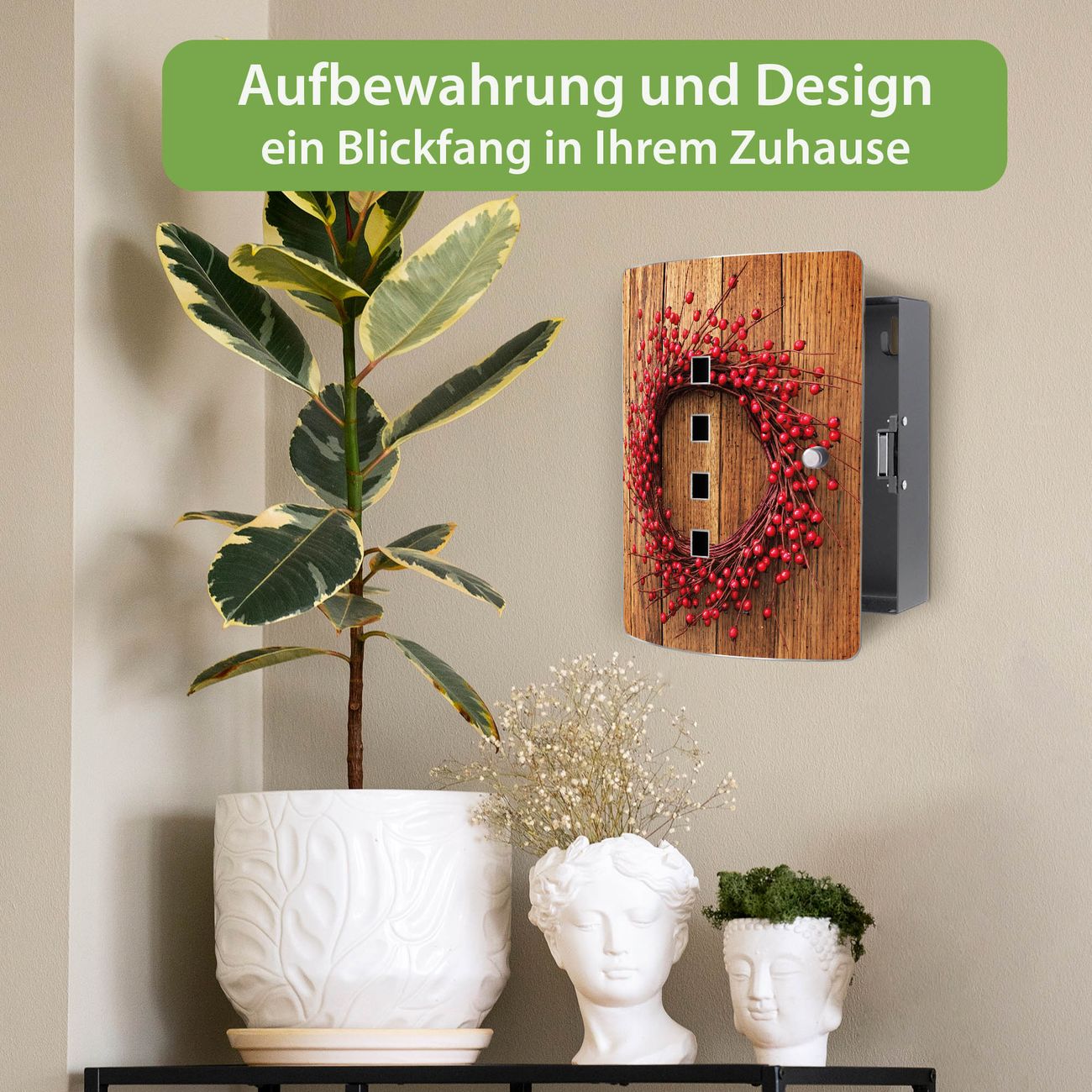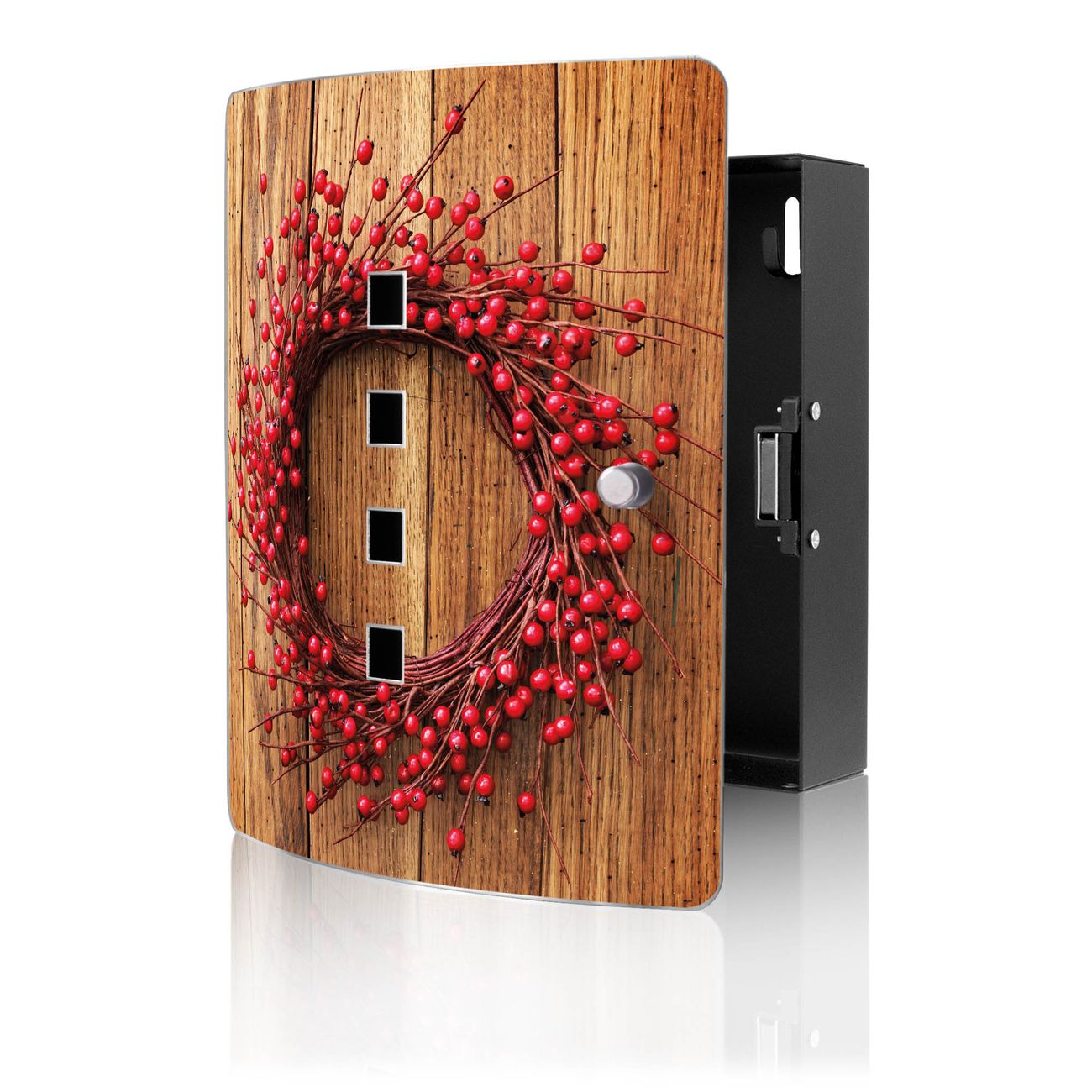 Funktion / Nutzen: Die leicht geschwungene Edelstahltür ist mit einer hochwertigen Motivfolie und dem Motiv Motiv Weihnachtskranz kaschiert. Ein praktischer Magnetverschluss ermöglicht Ihnen ein schnelles Öffnen und Schließen. Befestigt wird der Schlüsselkasten an 2 Stellen auf der Rückseite, passendes Montagematerial fügen wir bereits bei.