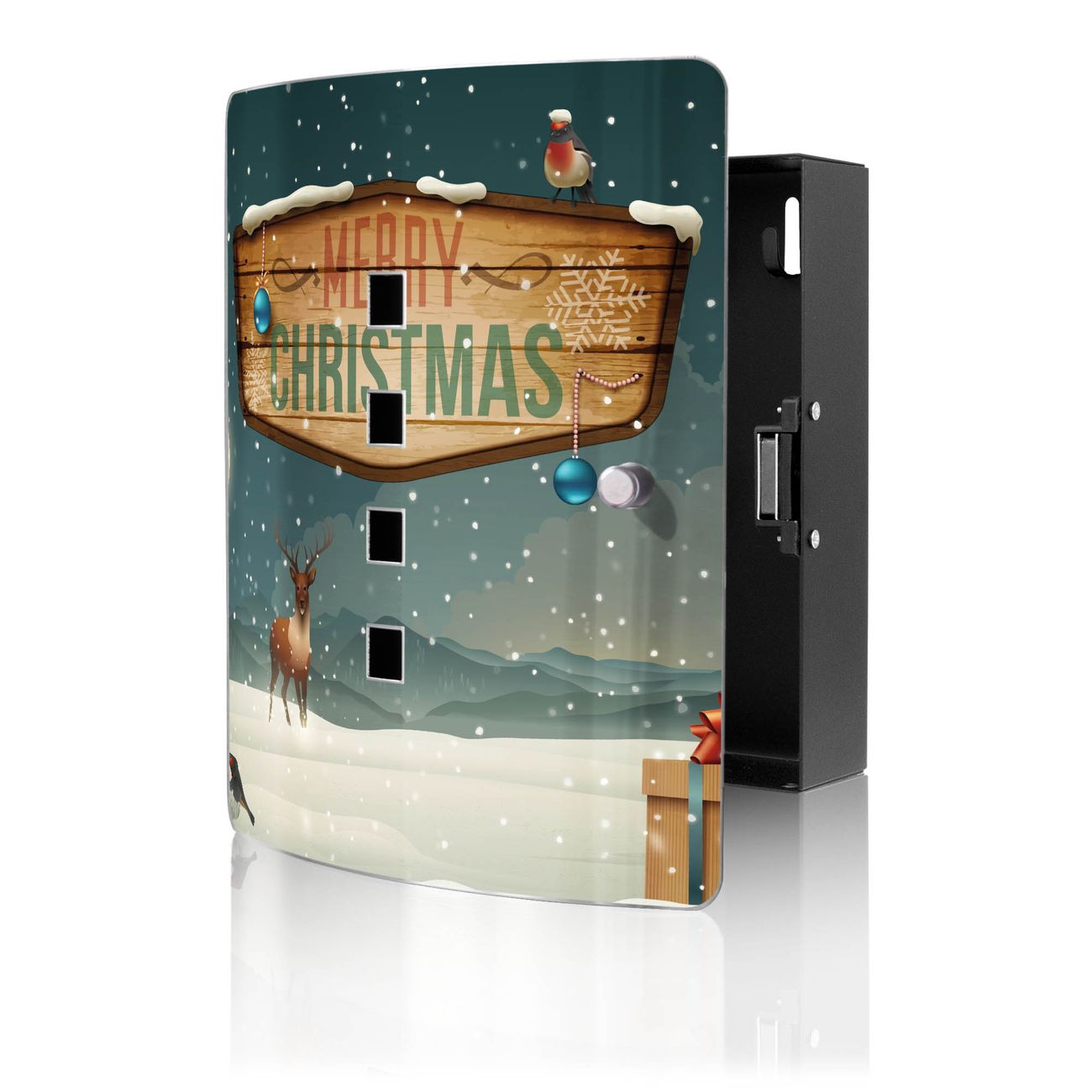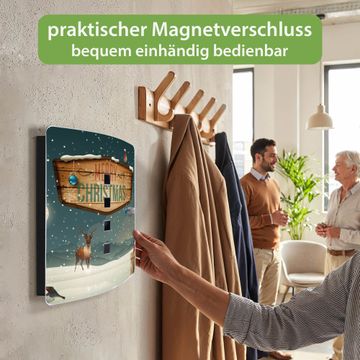 Funktion / Nutzen: Die leicht geschwungene Edelstahltür ist mit einer hochwertigen Motivfolie und dem Motiv Motiv Weihnachtsland kaschiert. Ein praktischer Magnetverschluss ermöglicht Ihnen ein schnelles Öffnen und Schließen. Befestigt wird der Schlüsselkasten an 2 Stellen auf der Rückseite, passendes Montagematerial fügen wir bereits bei.