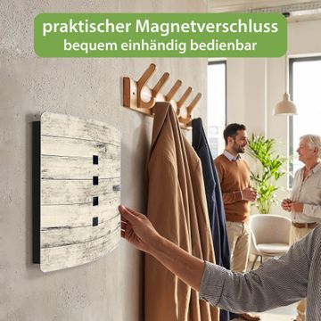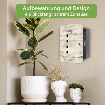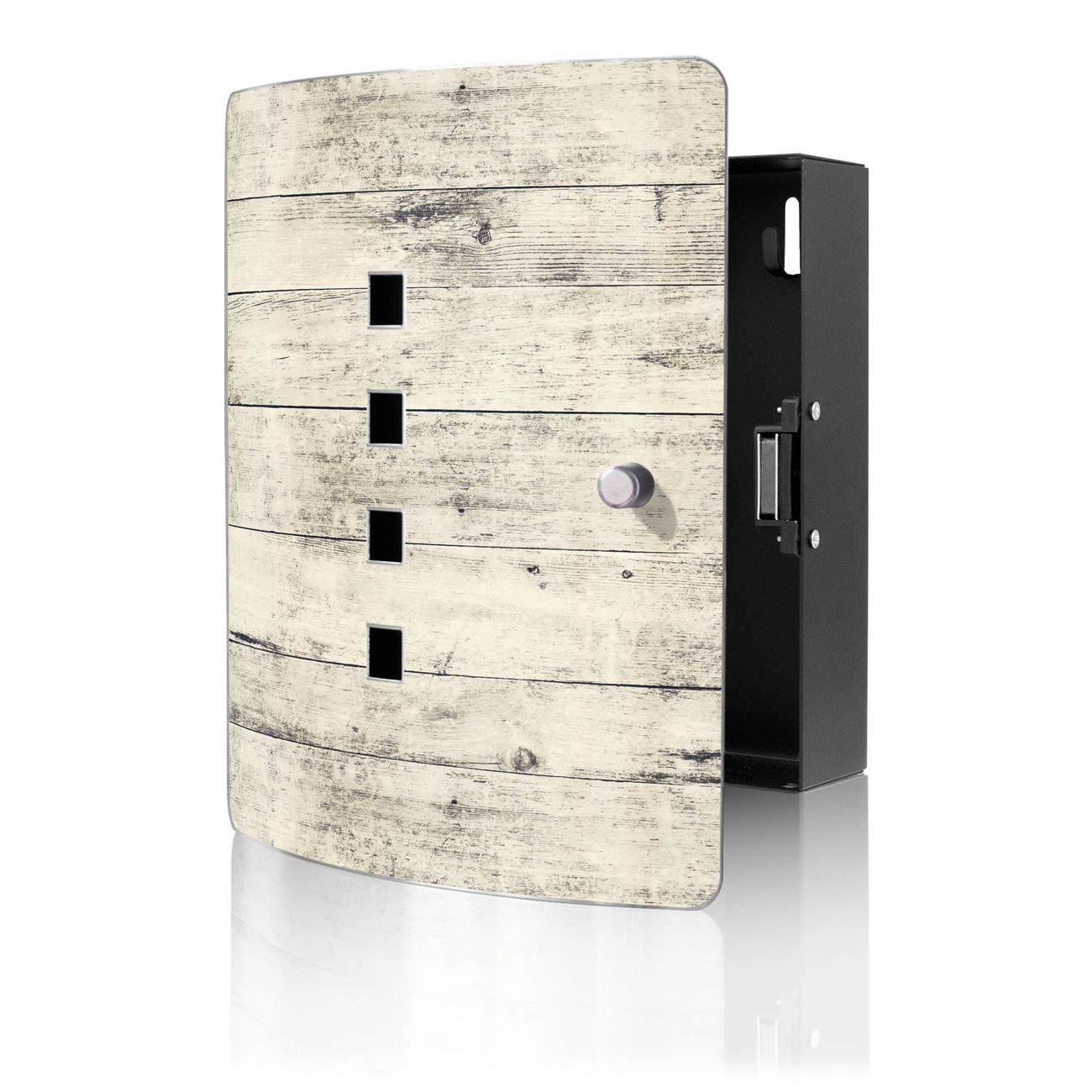 Funktion / Nutzen: Die leicht geschwungene Edelstahltür ist mit einer hochwertigen Motivfolie und dem Motiv Motiv Weiße Planken H kaschiert. Ein praktischer Magnetverschluss ermöglicht Ihnen ein schnelles Öffnen und Schließen. Befestigt wird der Schlüsselkasten an 2 Stellen auf der Rückseite, passendes Montagematerial fügen wir bereits bei.