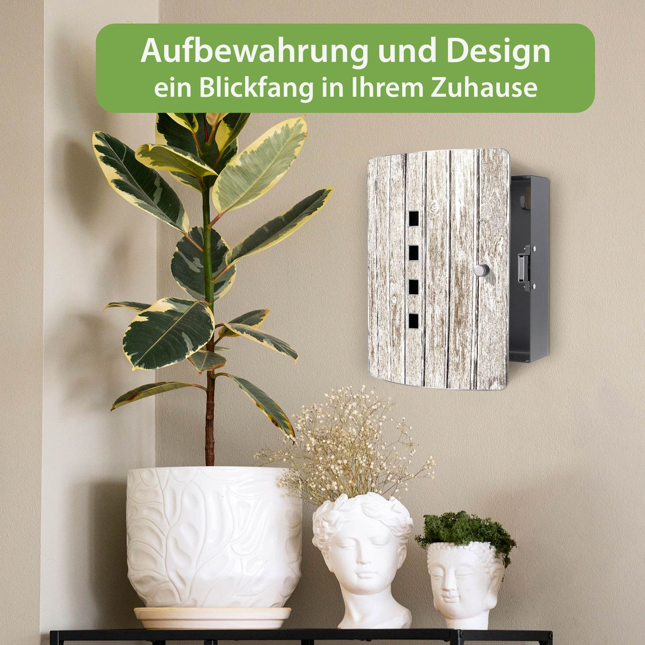 Funktion / Nutzen: Die leicht geschwungene Edelstahltür ist mit einer hochwertigen Motivfolie und dem Motiv Motiv Weißes Holz kaschiert. Ein praktischer Magnetverschluss ermöglicht Ihnen ein schnelles Öffnen und Schließen. Befestigt wird der Schlüsselkasten an 2 Stellen auf der Rückseite, passendes Montagematerial fügen wir bereits bei.