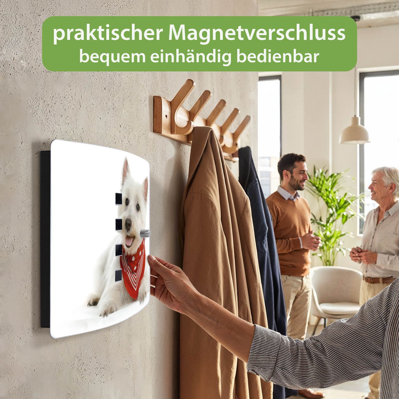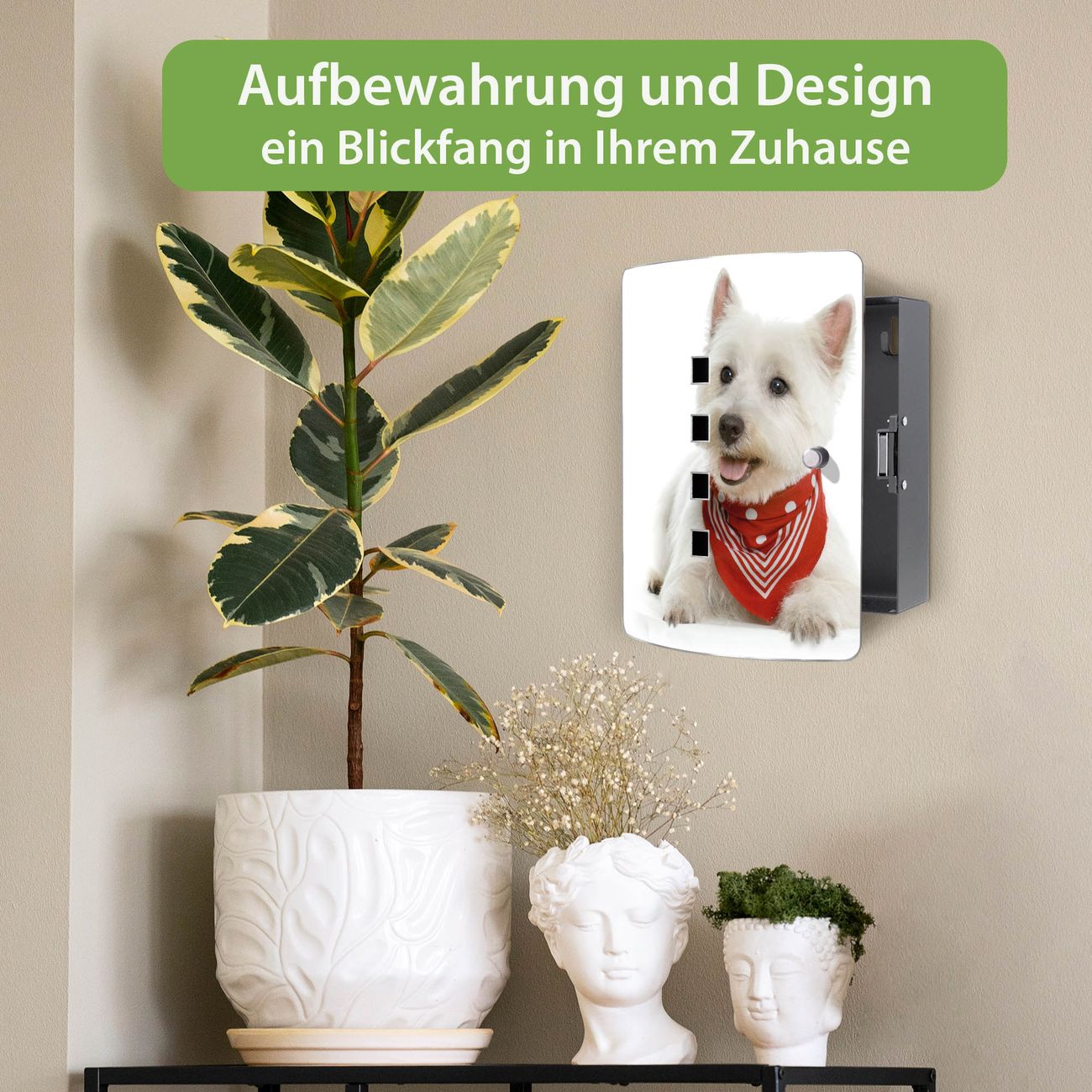 Funktion / Nutzen: Die leicht geschwungene Edelstahltür ist mit einer hochwertigen Motivfolie und dem Motiv Motiv Westie kaschiert. Ein praktischer Magnetverschluss ermöglicht Ihnen ein schnelles Öffnen und Schließen. Befestigt wird der Schlüsselkasten an 2 Stellen auf der Rückseite, passendes Montagematerial fügen wir bereits bei.