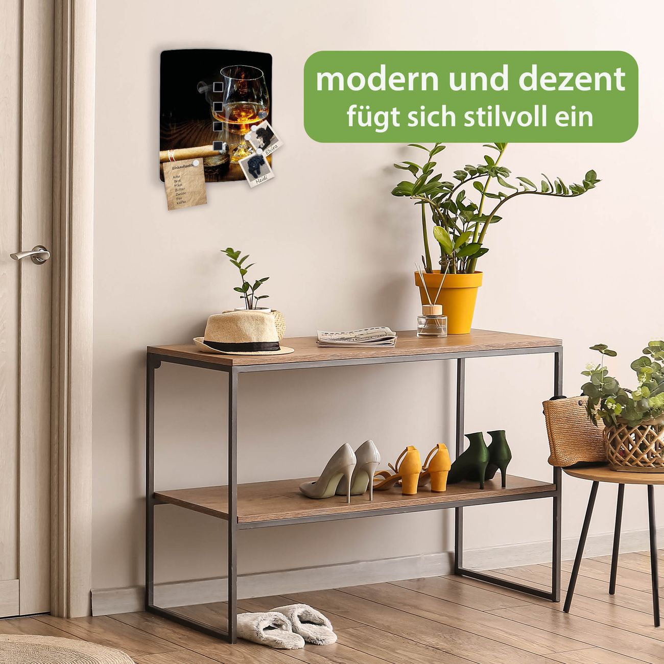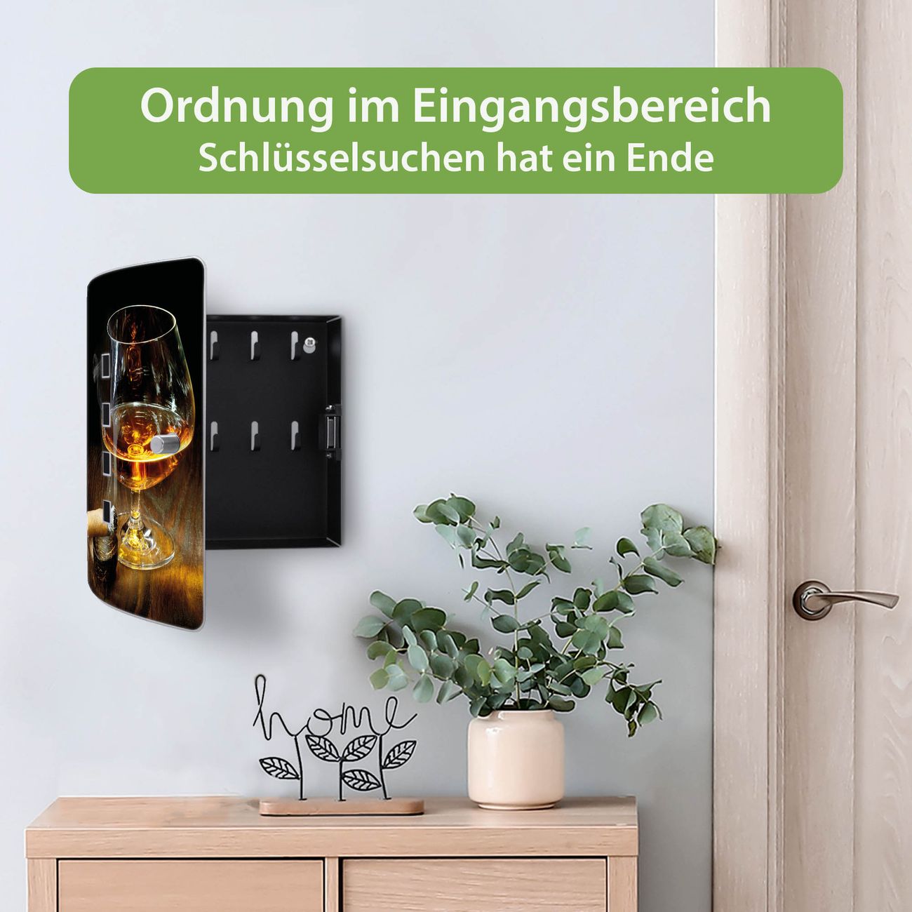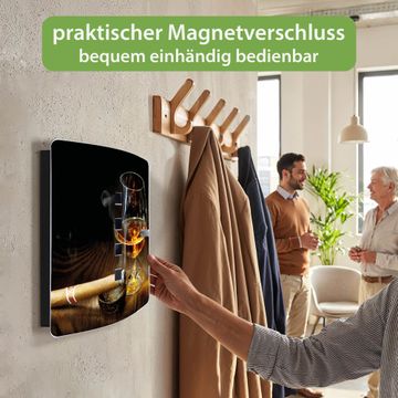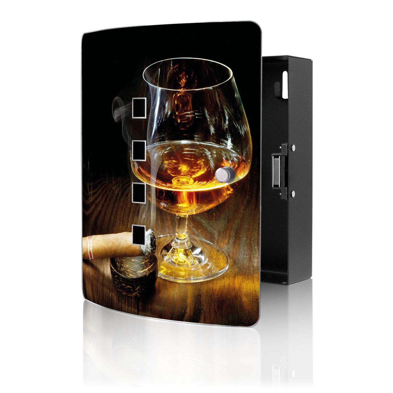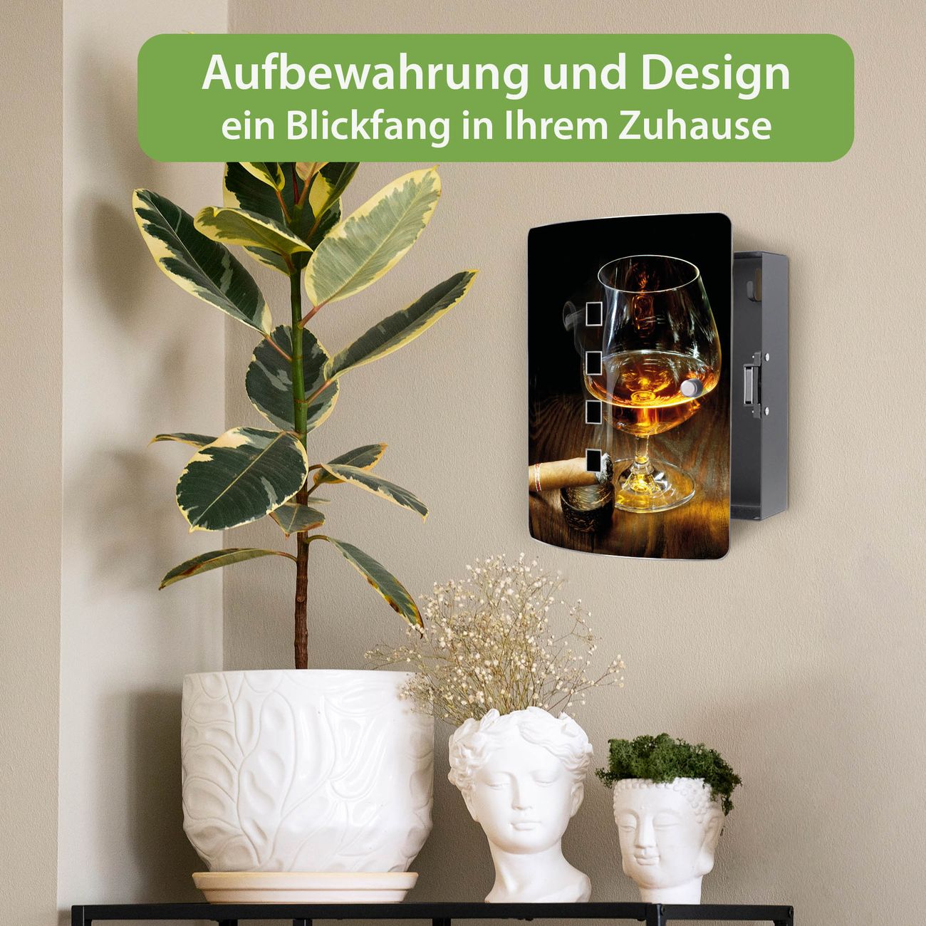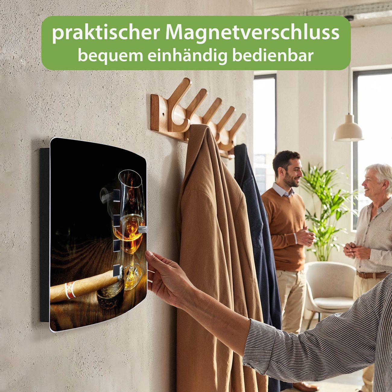 Funktion / Nutzen: Die leicht geschwungene Edelstahltür ist mit einer hochwertigen Motivfolie und dem Motiv Motiv Whiskey & Cigar kaschiert. Ein praktischer Magnetverschluss ermöglicht Ihnen ein schnelles Öffnen und Schließen. Befestigt wird der Schlüsselkasten an 2 Stellen auf der Rückseite, passendes Montagematerial fügen wir bereits bei.