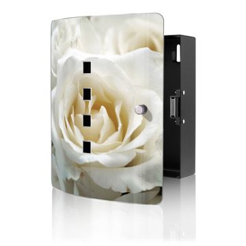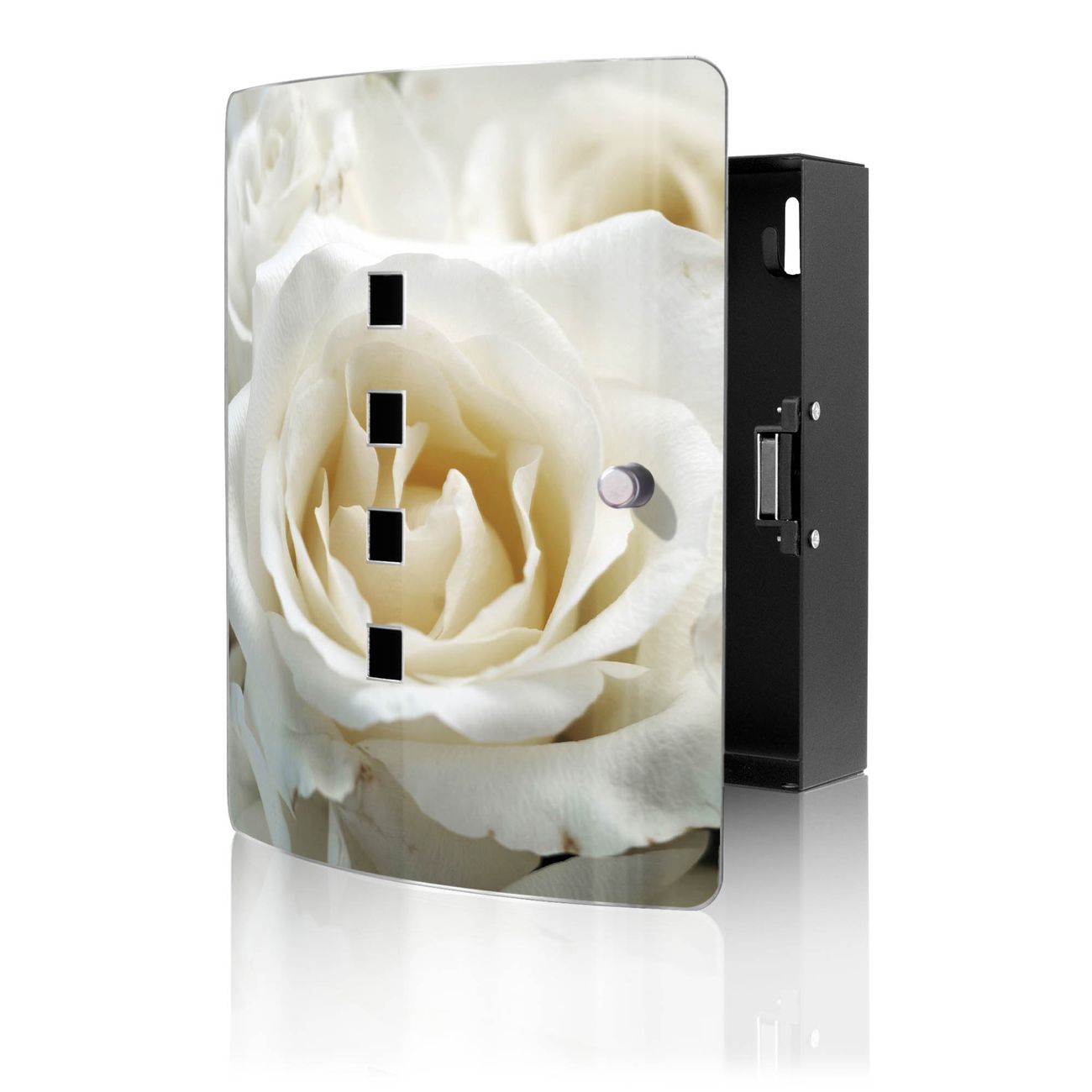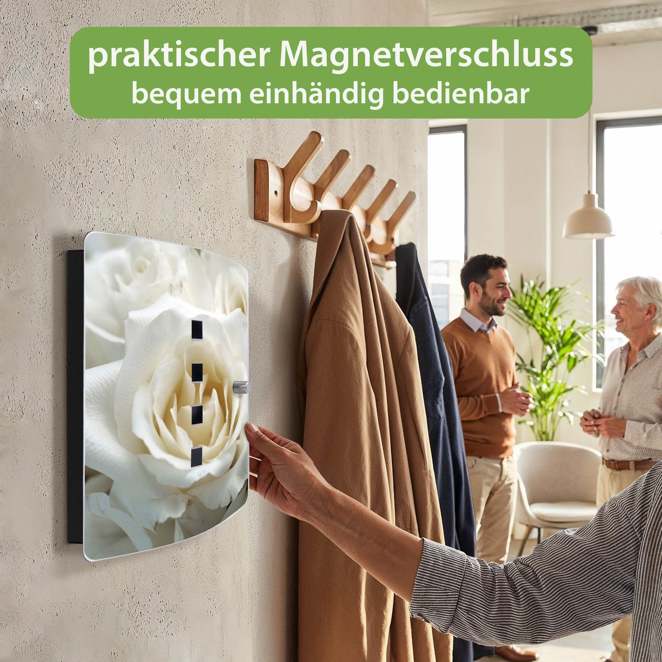 Funktion / Nutzen: Die leicht geschwungene Edelstahltür ist mit einer hochwertigen Motivfolie und dem Motiv Motiv White Roses kaschiert. Ein praktischer Magnetverschluss ermöglicht Ihnen ein schnelles Öffnen und Schließen. Befestigt wird der Schlüsselkasten an 2 Stellen auf der Rückseite, passendes Montagematerial fügen wir bereits bei.