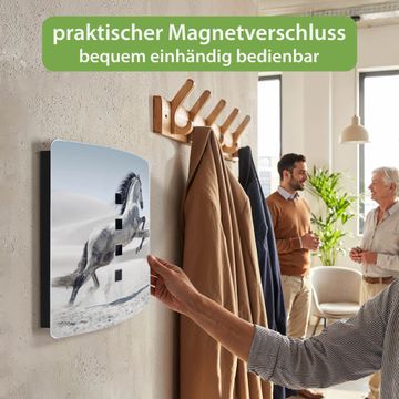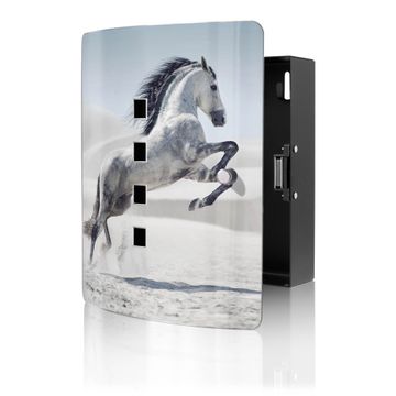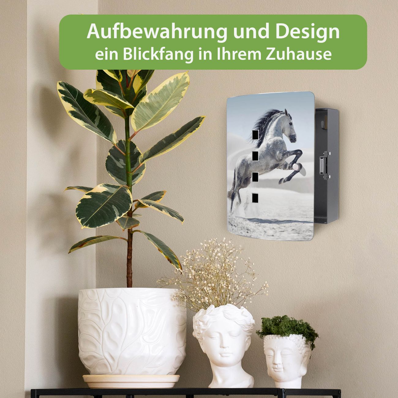 Funktion / Nutzen: Die leicht geschwungene Edelstahltür ist mit einer hochwertigen Motivfolie und dem Motiv Motiv Wildes Pferd kaschiert. Ein praktischer Magnetverschluss ermöglicht Ihnen ein schnelles Öffnen und Schließen. Befestigt wird der Schlüsselkasten an 2 Stellen auf der Rückseite, passendes Montagematerial fügen wir bereits bei.