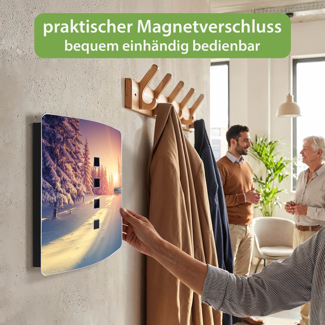 Funktion / Nutzen: Die leicht geschwungene Edelstahltür ist mit einer hochwertigen Motivfolie und dem Motiv Motiv Winterabend kaschiert. Ein praktischer Magnetverschluss ermöglicht Ihnen ein schnelles Öffnen und Schließen. Befestigt wird der Schlüsselkasten an 2 Stellen auf der Rückseite, passendes Montagematerial fügen wir bereits bei.