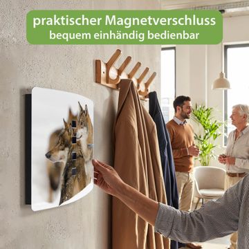 Funktion / Nutzen: Die leicht geschwungene Edelstahltür ist mit einer hochwertigen Motivfolie und dem Motiv Motiv Wölfe kaschiert. Ein praktischer Magnetverschluss ermöglicht Ihnen ein schnelles Öffnen und Schließen. Befestigt wird der Schlüsselkasten an 2 Stellen auf der Rückseite, passendes Montagematerial fügen wir bereits bei.