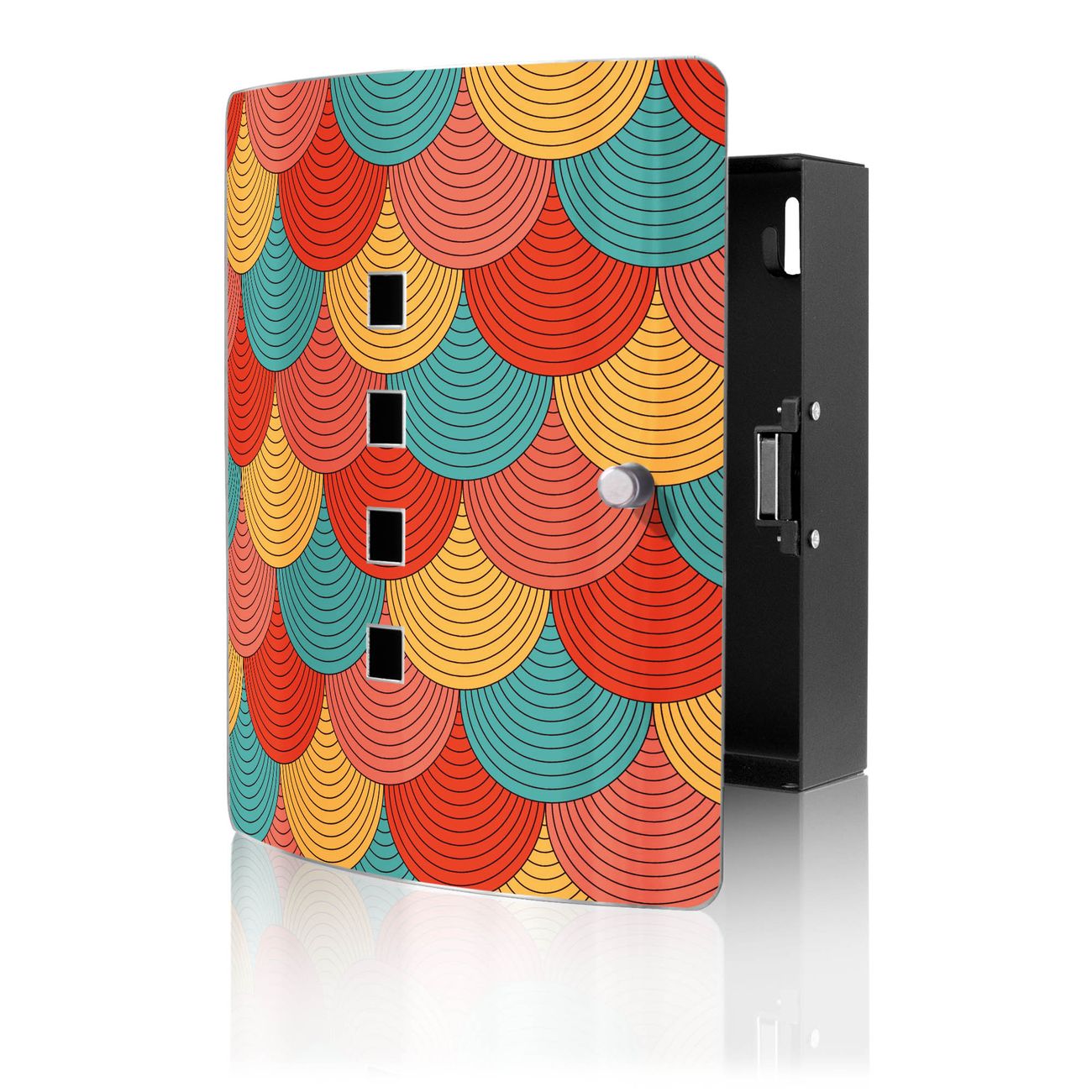Der Schlüsselkasten ist gesamt 24x21x5cm groß und wiegt ca. 900g. Die Fronttür hat eine 90° Öffnung und besteht aus Edelstahl. Das Gehäuse ist zeitlos schwarz und aus Stahl gefertigt.