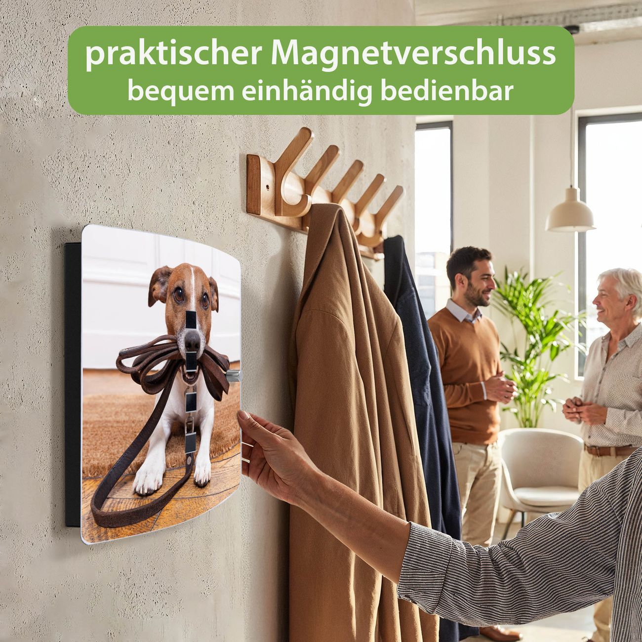 Funktion / Nutzen: Die leicht geschwungene Edelstahltür ist mit einer hochwertigen Motivfolie und dem Motiv Motiv Wowka kaschiert. Ein praktischer Magnetverschluss ermöglicht Ihnen ein schnelles Öffnen und Schließen. Befestigt wird der Schlüsselkasten an 2 Stellen auf der Rückseite, passendes Montagematerial fügen wir bereits bei.