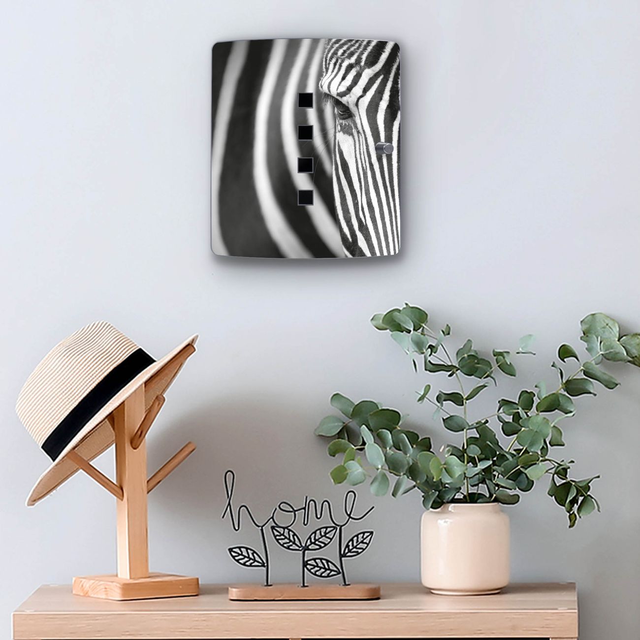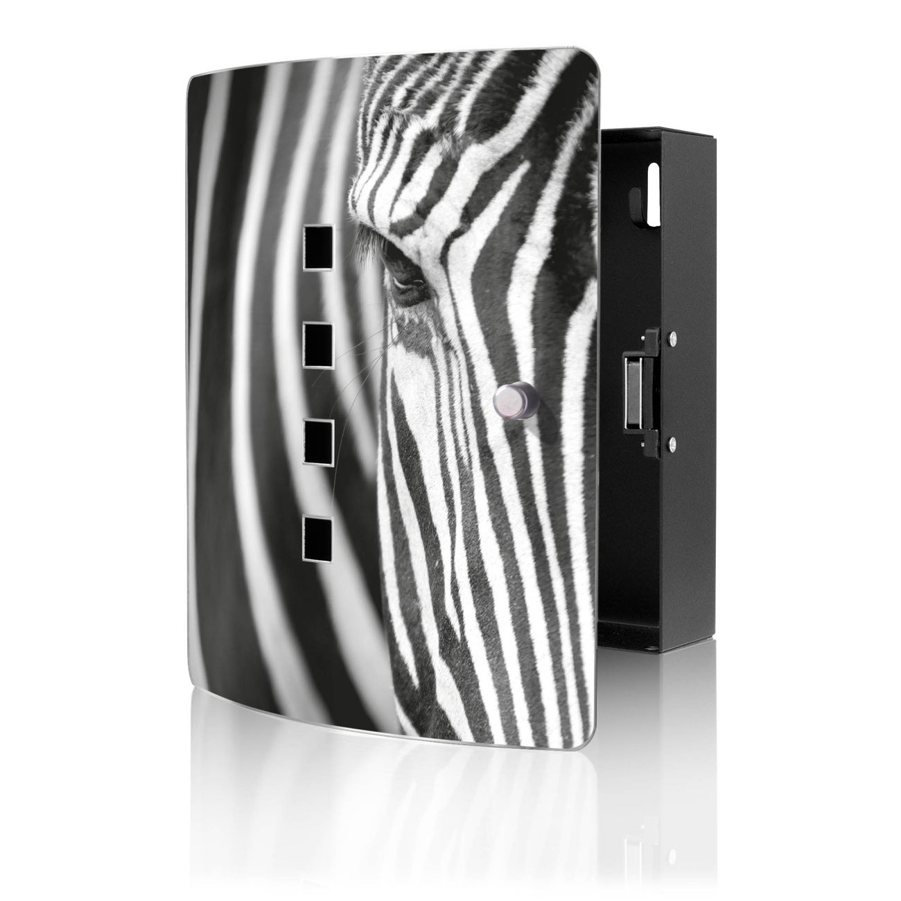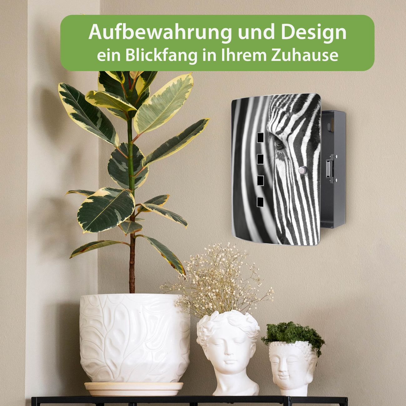 Funktion / Nutzen: Die leicht geschwungene Edelstahltür ist mit einer hochwertigen Motivfolie und dem Motiv Motiv Zebra En Face kaschiert. Ein praktischer Magnetverschluss ermöglicht Ihnen ein schnelles Öffnen und Schließen. Befestigt wird der Schlüsselkasten an 2 Stellen auf der Rückseite, passendes Montagematerial fügen wir bereits bei.
