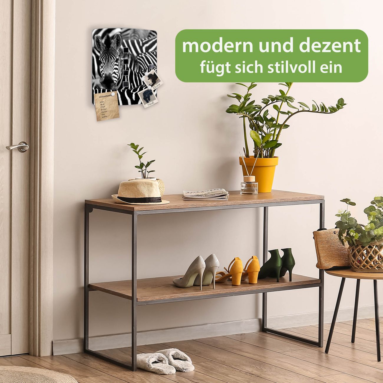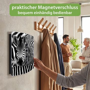 Funktion / Nutzen: Die leicht geschwungene Edelstahltür ist mit einer hochwertigen Motivfolie und dem Motiv Motiv Zebras kaschiert. Ein praktischer Magnetverschluss ermöglicht Ihnen ein schnelles Öffnen und Schließen. Befestigt wird der Schlüsselkasten an 2 Stellen auf der Rückseite, passendes Montagematerial fügen wir bereits bei.