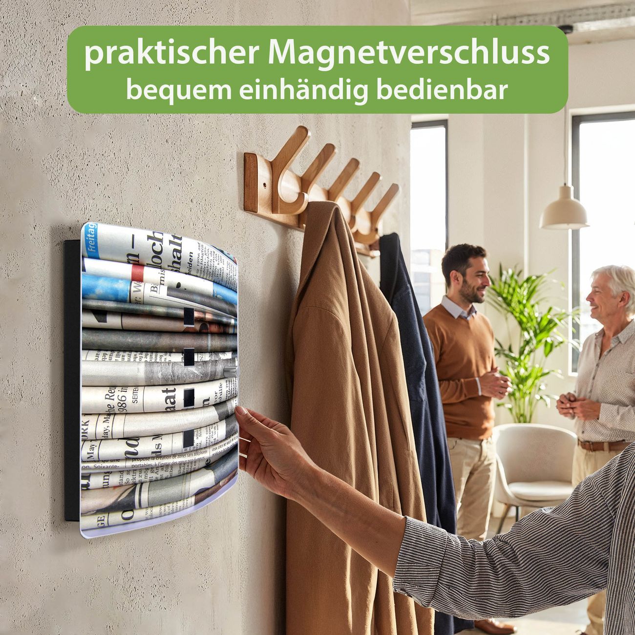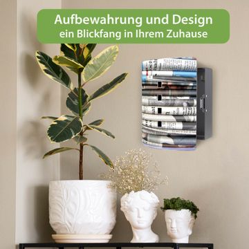 Funktion / Nutzen: Die leicht geschwungene Edelstahltür ist mit einer hochwertigen Motivfolie und dem Motiv Motiv Zeitungen kaschiert. Ein praktischer Magnetverschluss ermöglicht Ihnen ein schnelles Öffnen und Schließen. Befestigt wird der Schlüsselkasten an 2 Stellen auf der Rückseite, passendes Montagematerial fügen wir bereits bei.