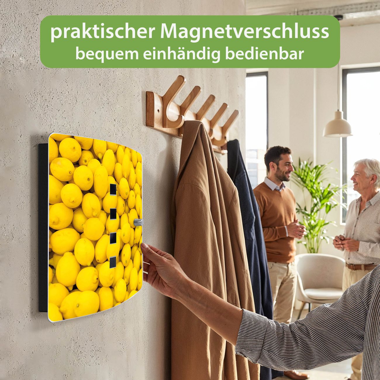Funktion / Nutzen: Die leicht geschwungene Edelstahltür ist mit einer hochwertigen Motivfolie und dem Motiv Motiv Zitronen kaschiert. Ein praktischer Magnetverschluss ermöglicht Ihnen ein schnelles Öffnen und Schließen. Befestigt wird der Schlüsselkasten an 2 Stellen auf der Rückseite, passendes Montagematerial fügen wir bereits bei.