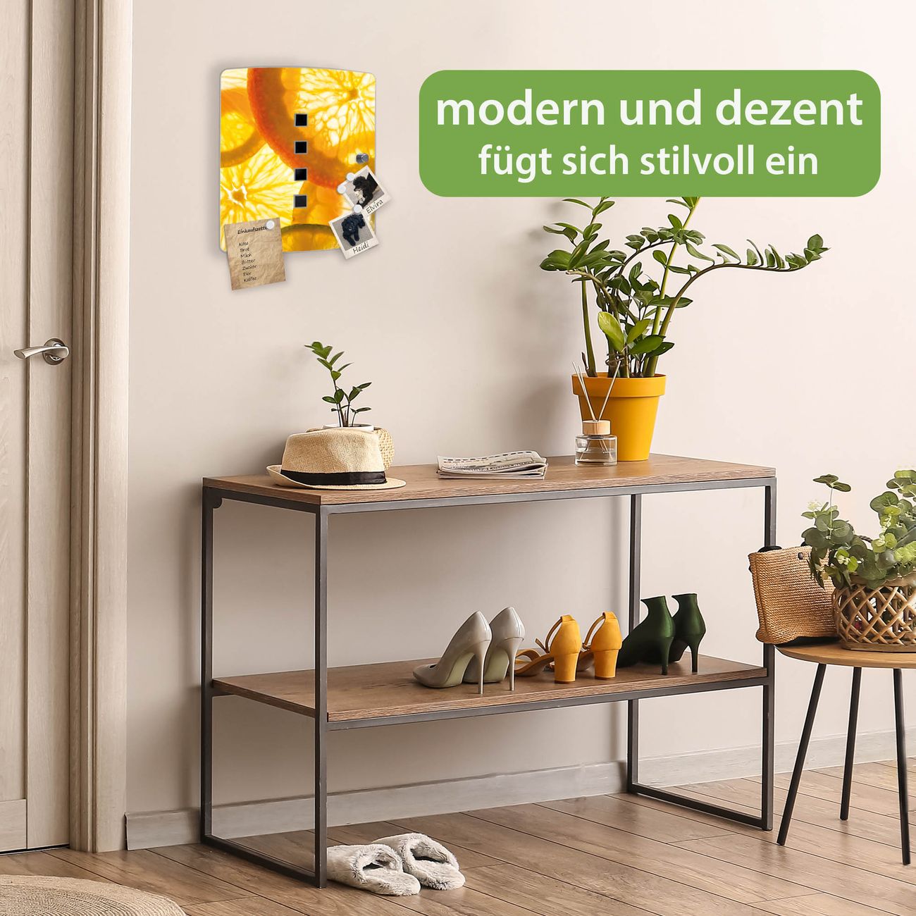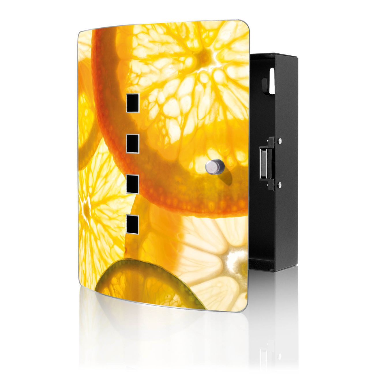 Funktion / Nutzen: Die leicht geschwungene Edelstahltür ist mit einer hochwertigen Motivfolie und dem Motiv Motiv Zitrusfrüchte kaschiert. Ein praktischer Magnetverschluss ermöglicht Ihnen ein schnelles Öffnen und Schließen. Befestigt wird der Schlüsselkasten an 2 Stellen auf der Rückseite, passendes Montagematerial fügen wir bereits bei.