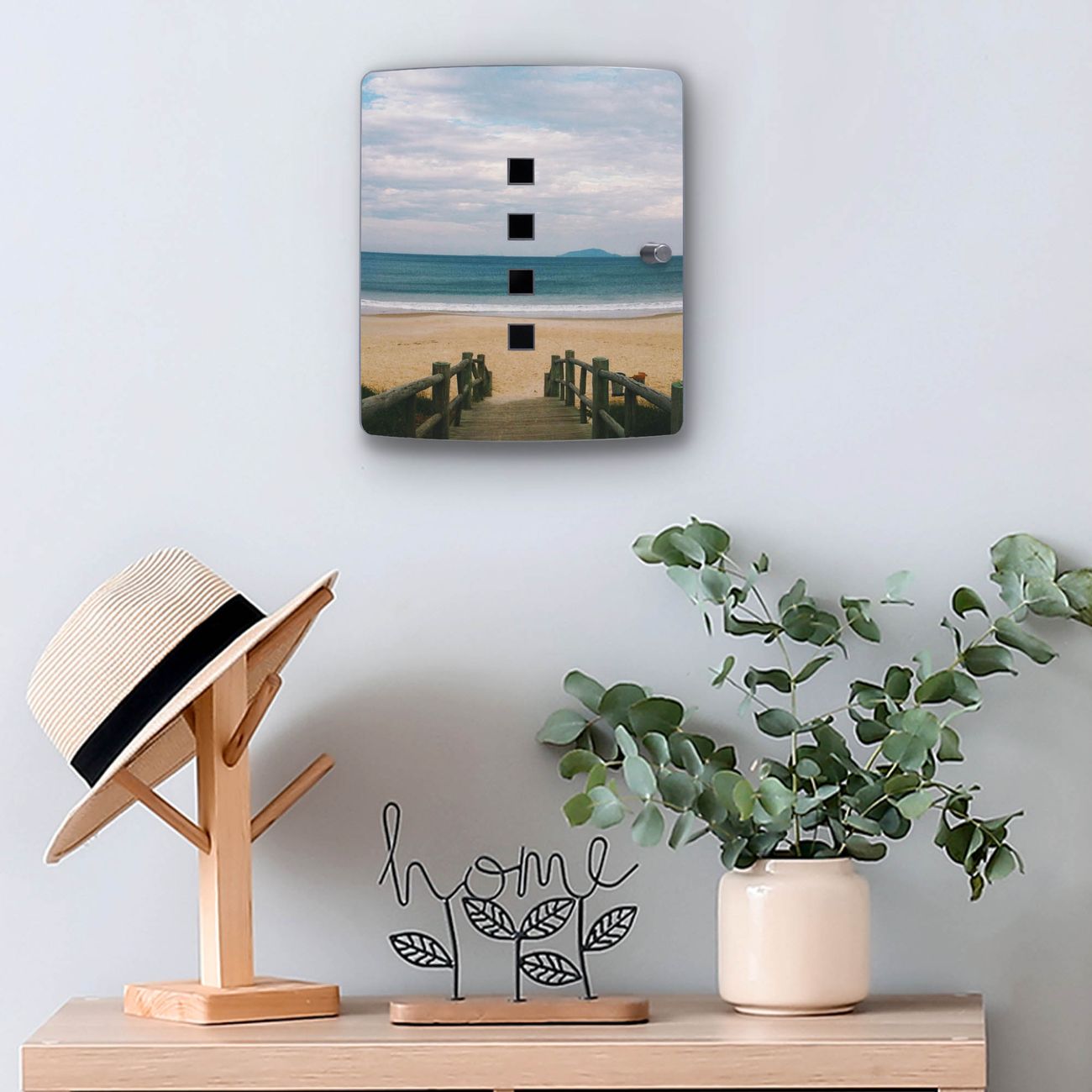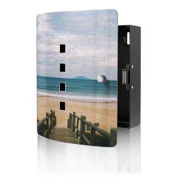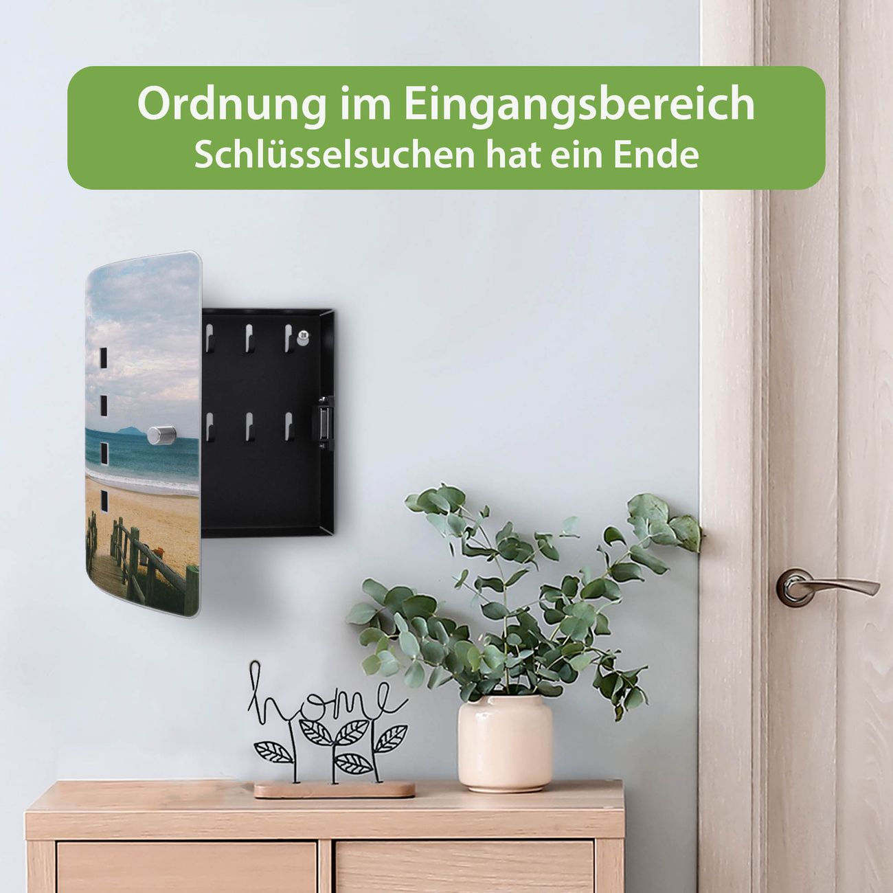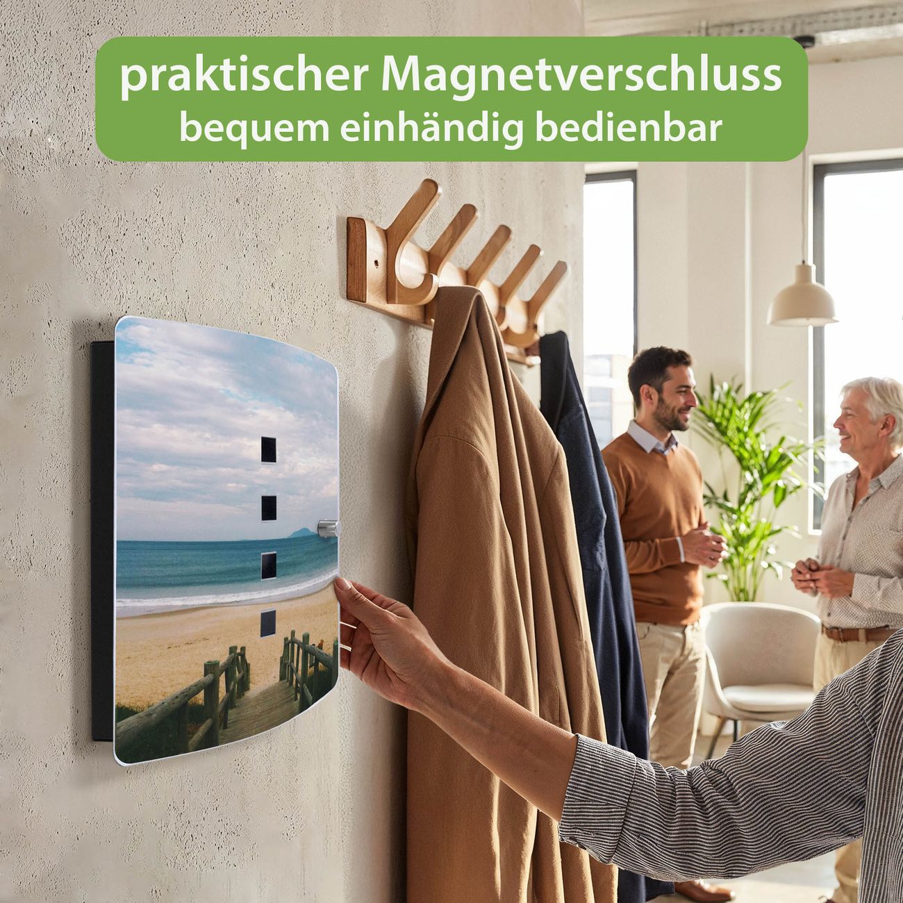 Funktion / Nutzen: Die leicht geschwungene Edelstahltür ist mit einer hochwertigen Motivfolie und dem Motiv Motiv Zum Strand kaschiert. Ein praktischer Magnetverschluss ermöglicht Ihnen ein schnelles Öffnen und Schließen. Befestigt wird der Schlüsselkasten an 2 Stellen auf der Rückseite, passendes Montagematerial fügen wir bereits bei.