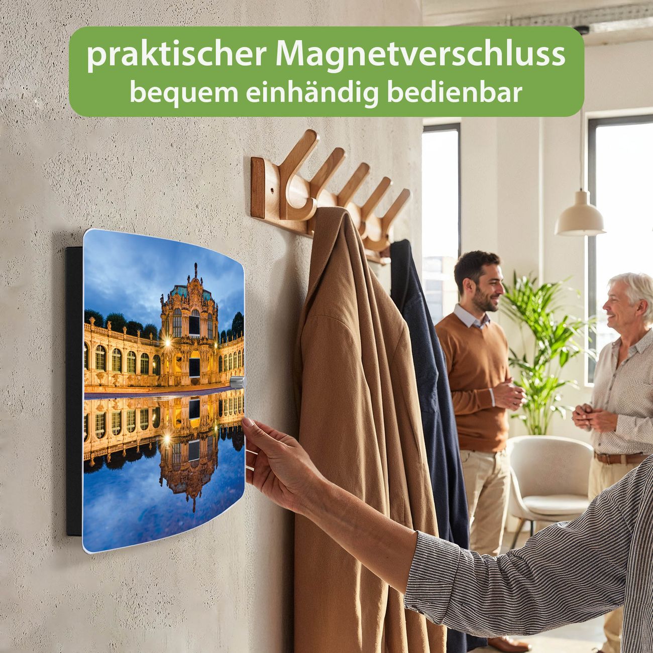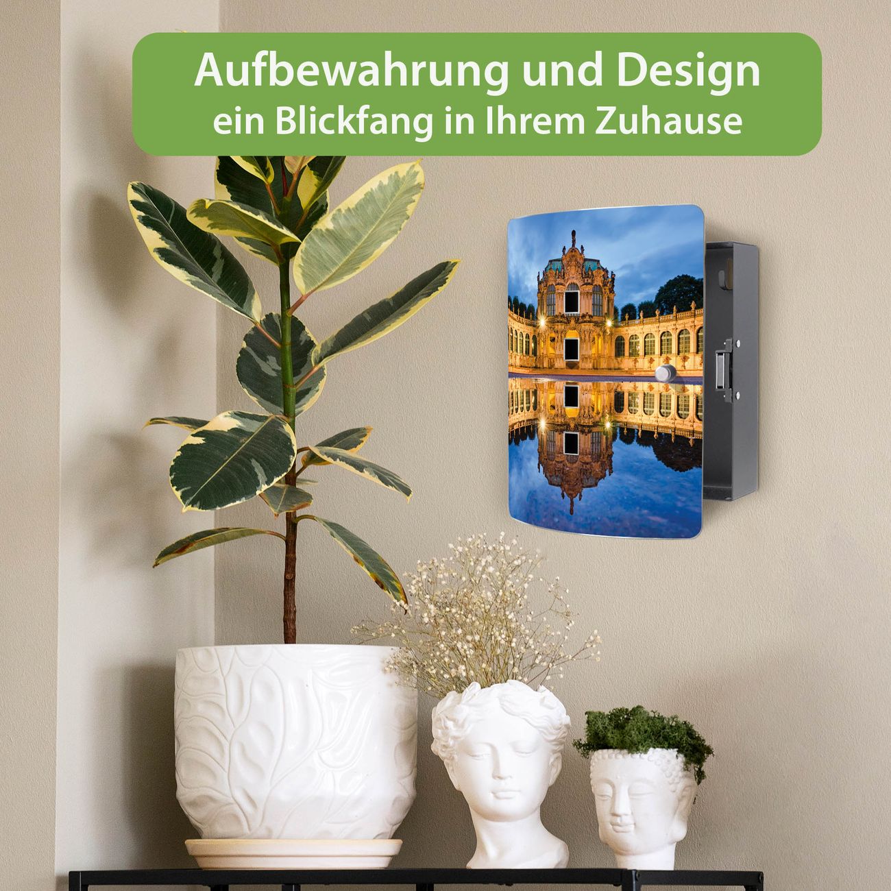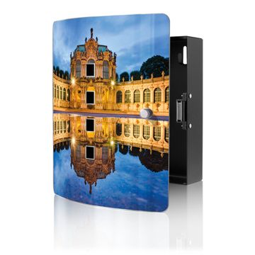 Funktion / Nutzen: Die leicht geschwungene Edelstahltür ist mit einer hochwertigen Motivfolie und dem Motiv Motiv Zwinger Dresden kaschiert. Ein praktischer Magnetverschluss ermöglicht Ihnen ein schnelles Öffnen und Schließen. Befestigt wird der Schlüsselkasten an 2 Stellen auf der Rückseite, passendes Montagematerial fügen wir bereits bei.