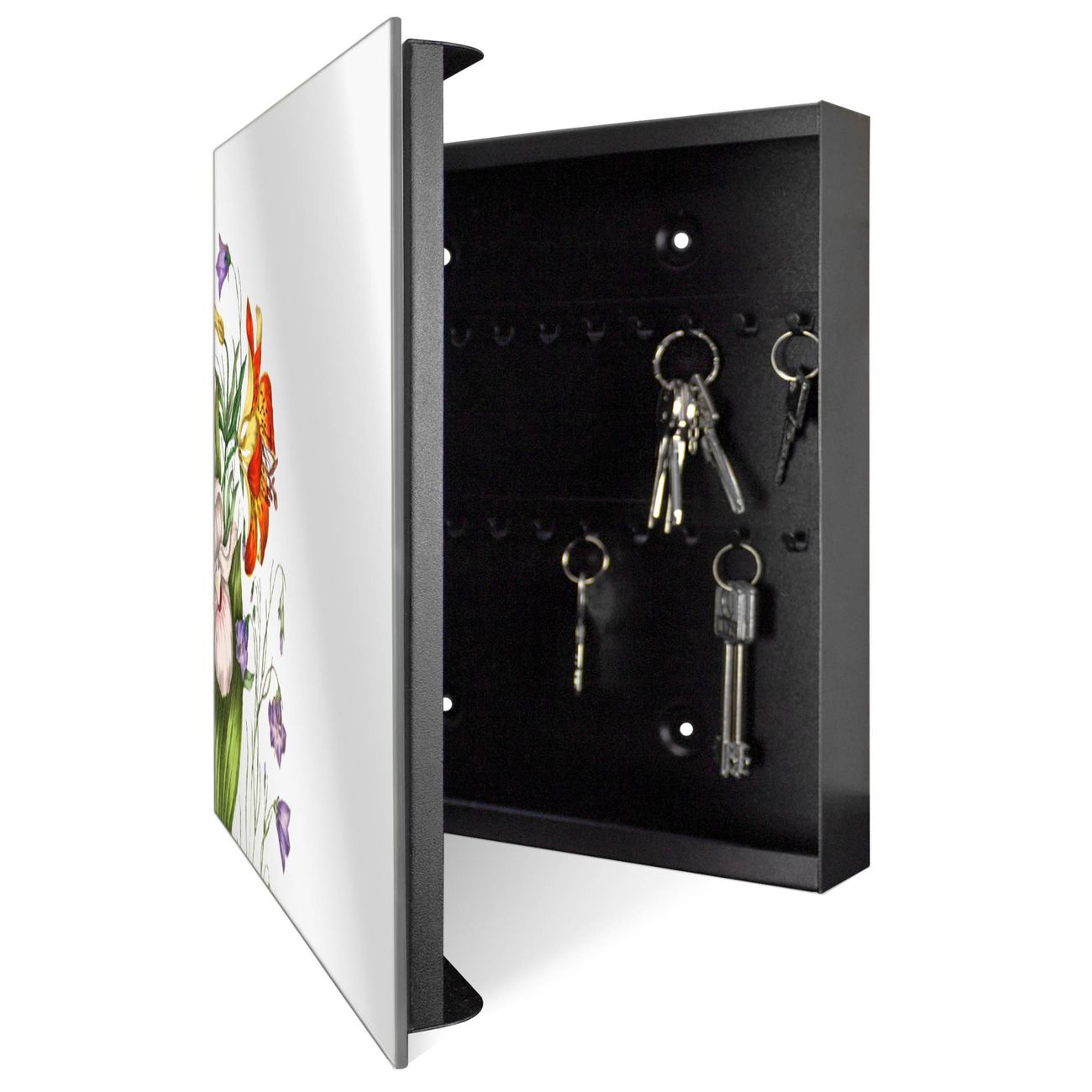 Bringe Ordnung und Stil in deinen Eingangsbereich mit dem banjado Schlüsselkasten mit Spiegel. Die elegante Spiegelfront kombiniert Funktionalität mit modernem Design und macht die Schlüsselaufbewahrung zu einem dekorativen Highlight. ✅ Spiegel Schlüsselaufbewahrung mit Motiv Motiv Blumen Aquarell 2 Der Design-Schlüsselkasten Motiv Motiv Blumen Aquarell 2 bietet Platz für bis zu 50 Schlüssel, die auf 5 stabilen Reihen mit je 10 Haken übersichtlich verstaut werden. Mit seinen kompakten Maßen von 30 x 30 x 5 cm passt die Schlüsselbox perfekt auch in kleinere Räume. Der schwarz lackierte Stahlkorpus mit rechts angeschlagenem Türscharnier harmoniert mit der Spiegelfront und fügt sich nahtlos in jedes Wohnambiente ein. Ob als Schlüsselorganizer für Zuhause oder als praktische Lösung für Büros, Praxen und Gewerbe, der banjado Schlüsselkasten sorgt für Ordnung und Übersicht. Die Spiegelfront verleiht dem Eingangsbereich zusätzliche Funktionalität und lässt Räume optisch größer wirken. Die Schlüsselbox Motiv Motiv Blumen Aquarell 2 zur Wandmontage wird inklusive Befestigungsmaterial geliefert und ist schnell angebracht. So hast du deine Schlüssel jederzeit griffbereit und zugleich stilvoll verstaut. Mit diesem banjado Schlüsselkasten Motiv Motiv Blumen Aquarell 2 kombinierst du praktische Aufbewahrung mit stilvollem Wohndesign. Ob privat oder geschäftlich, die Schlüsselbox sorgt für mehr Ordnung, Übersicht und ein wohnliches Ambiente.Vorteile im Überblick