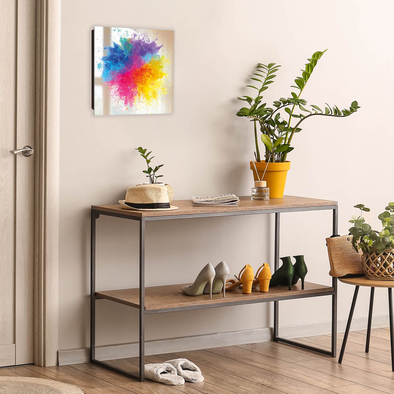 Bringe Ordnung und Stil in deinen Eingangsbereich mit dem banjado Schlüsselkasten mit Spiegel. Die elegante Spiegelfront kombiniert Funktionalität mit modernem Design und macht die Schlüsselaufbewahrung zu einem dekorativen Highlight. ✅ Spiegel Schlüsselaufbewahrung mit Motiv Motiv Farbexplosion 2 Der Design-Schlüsselkasten Motiv Motiv Farbexplosion 2 bietet Platz für bis zu 50 Schlüssel, die auf 5 stabilen Reihen mit je 10 Haken übersichtlich verstaut werden. Mit seinen kompakten Maßen von 30 x 30 x 5 cm passt die Schlüsselbox perfekt auch in kleinere Räume. Der schwarz lackierte Stahlkorpus mit rechts angeschlagenem Türscharnier harmoniert mit der Spiegelfront und fügt sich nahtlos in jedes Wohnambiente ein. Ob als Schlüsselorganizer für Zuhause oder als praktische Lösung für Büros, Praxen und Gewerbe, der banjado Schlüsselkasten sorgt für Ordnung und Übersicht. Die Spiegelfront verleiht dem Eingangsbereich zusätzliche Funktionalität und lässt Räume optisch größer wirken. Die Schlüsselbox Motiv Motiv Farbexplosion 2 zur Wandmontage wird inklusive Befestigungsmaterial geliefert und ist schnell angebracht. So hast du deine Schlüssel jederzeit griffbereit und zugleich stilvoll verstaut. Mit diesem banjado Schlüsselkasten Motiv Motiv Farbexplosion 2 kombinierst du praktische Aufbewahrung mit stilvollem Wohndesign. Ob privat oder geschäftlich, die Schlüsselbox sorgt für mehr Ordnung, Übersicht und ein wohnliches Ambiente.Vorteile im Überblick
