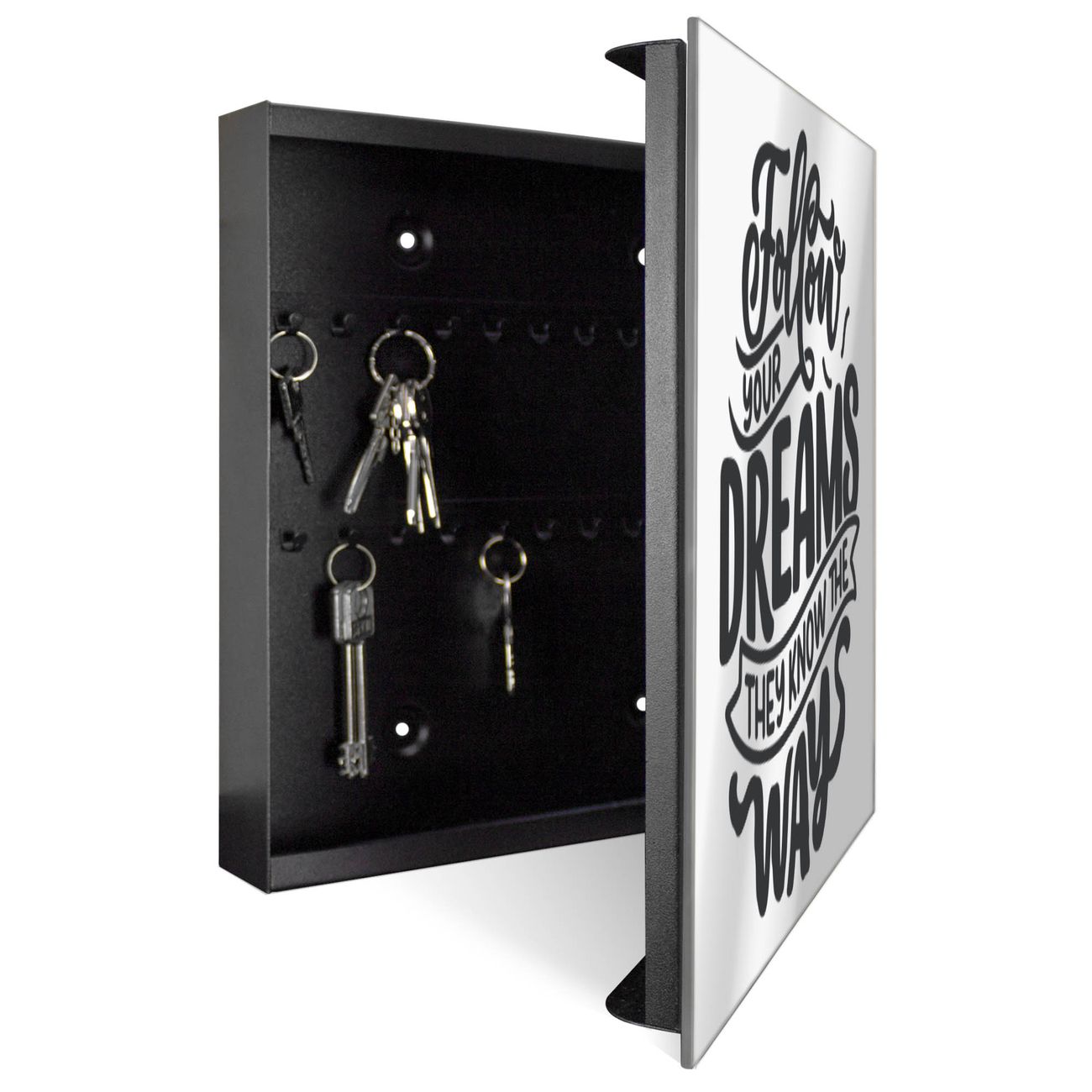 Bringe Ordnung und Stil in deinen Eingangsbereich mit dem banjado Schlüsselkasten mit Spiegel. Die elegante Spiegelfront kombiniert Funktionalität mit modernem Design und macht die Schlüsselaufbewahrung zu einem dekorativen Highlight. ✅ Spiegel Schlüsselaufbewahrung mit Motiv Motiv Follow your Dreams 2 Der Design-Schlüsselkasten Motiv Motiv Follow your Dreams 2 bietet Platz für bis zu 50 Schlüssel, die auf 5 stabilen Reihen mit je 10 Haken übersichtlich verstaut werden. Mit seinen kompakten Maßen von 30 x 30 x 5 cm passt die Schlüsselbox perfekt auch in kleinere Räume. Der schwarz lackierte Stahlkorpus mit rechts angeschlagenem Türscharnier harmoniert mit der Spiegelfront und fügt sich nahtlos in jedes Wohnambiente ein. Ob als Schlüsselorganizer für Zuhause oder als praktische Lösung für Büros, Praxen und Gewerbe, der banjado Schlüsselkasten sorgt für Ordnung und Übersicht. Die Spiegelfront verleiht dem Eingangsbereich zusätzliche Funktionalität und lässt Räume optisch größer wirken. Die Schlüsselbox Motiv Motiv Follow your Dreams 2 zur Wandmontage wird inklusive Befestigungsmaterial geliefert und ist schnell angebracht. So hast du deine Schlüssel jederzeit griffbereit und zugleich stilvoll verstaut. Mit diesem banjado Schlüsselkasten Motiv Motiv Follow your Dreams 2 kombinierst du praktische Aufbewahrung mit stilvollem Wohndesign. Ob privat oder geschäftlich, die Schlüsselbox sorgt für mehr Ordnung, Übersicht und ein wohnliches Ambiente.Vorteile im Überblick