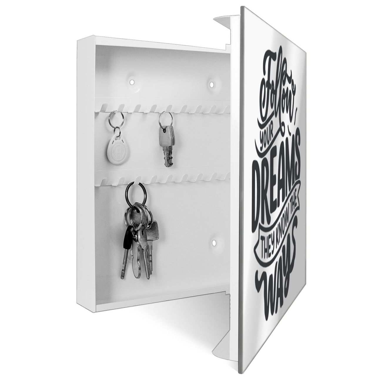 Bringe Ordnung und Stil in deinen Eingangsbereich mit dem banjado Schlüsselkasten mit Spiegel. Die elegante Spiegelfront kombiniert Funktionalität mit modernem Design und macht die Schlüsselaufbewahrung zu einem dekorativen Highlight. ✅ Spiegel Schlüsselaufbewahrung mit Motiv Motiv Follow your Dreams 2 Der Design-Schlüsselkasten Motiv Motiv Follow your Dreams 2 bietet Platz für bis zu 50 Schlüssel, die auf 5 stabilen Reihen mit je 10 Haken übersichtlich verstaut werden. Mit seinen kompakten Maßen von 30 x 30 x 5 cm passt die Schlüsselbox perfekt auch in kleinere Räume. Der weiß lackierte Stahlkorpus mit rechts angeschlagenem Türscharnier harmoniert mit der Spiegelfront und fügt sich nahtlos in jedes Wohnambiente ein. Ob als Schlüsselorganizer für Zuhause oder als praktische Lösung für Büros, Praxen und Gewerbe, der banjado Schlüsselkasten sorgt für Ordnung und Übersicht. Die Spiegelfront verleiht dem Eingangsbereich zusätzliche Funktionalität und lässt Räume optisch größer wirken. Die Schlüsselbox Motiv Motiv Follow your Dreams 2 zur Wandmontage wird inklusive Befestigungsmaterial geliefert und ist schnell angebracht. So hast du deine Schlüssel jederzeit griffbereit und zugleich stilvoll verstaut. Mit diesem banjado Schlüsselkasten Motiv Motiv Follow your Dreams 2 kombinierst du praktische Aufbewahrung mit stilvollem Wohndesign. Ob privat oder geschäftlich, die Schlüsselbox sorgt für mehr Ordnung, Übersicht und ein wohnliches Ambiente.Vorteile im Überblick