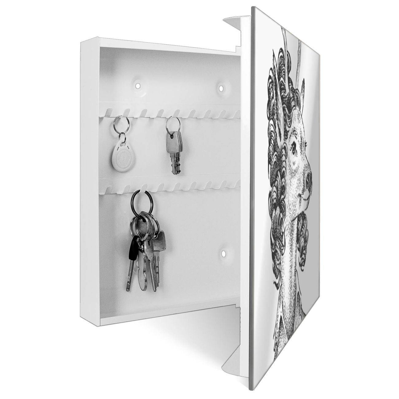 Bringe Ordnung und Stil in deinen Eingangsbereich mit dem banjado Schlüsselkasten mit Spiegel. Die elegante Spiegelfront kombiniert Funktionalität mit modernem Design und macht die Schlüsselaufbewahrung zu einem dekorativen Highlight. ✅ Spiegel Schlüsselaufbewahrung mit Motiv Motiv Frau Hirsch 2 Der Design-Schlüsselkasten Motiv Motiv Frau Hirsch 2 bietet Platz für bis zu 50 Schlüssel, die auf 5 stabilen Reihen mit je 10 Haken übersichtlich verstaut werden. Mit seinen kompakten Maßen von 30 x 30 x 5 cm passt die Schlüsselbox perfekt auch in kleinere Räume. Der weiß lackierte Stahlkorpus mit rechts angeschlagenem Türscharnier harmoniert mit der Spiegelfront und fügt sich nahtlos in jedes Wohnambiente ein. Ob als Schlüsselorganizer für Zuhause oder als praktische Lösung für Büros, Praxen und Gewerbe, der banjado Schlüsselkasten sorgt für Ordnung und Übersicht. Die Spiegelfront verleiht dem Eingangsbereich zusätzliche Funktionalität und lässt Räume optisch größer wirken. Die Schlüsselbox Motiv Motiv Frau Hirsch 2 zur Wandmontage wird inklusive Befestigungsmaterial geliefert und ist schnell angebracht. So hast du deine Schlüssel jederzeit griffbereit und zugleich stilvoll verstaut. Mit diesem banjado Schlüsselkasten Motiv Motiv Frau Hirsch 2 kombinierst du praktische Aufbewahrung mit stilvollem Wohndesign. Ob privat oder geschäftlich, die Schlüsselbox sorgt für mehr Ordnung, Übersicht und ein wohnliches Ambiente.Vorteile im Überblick