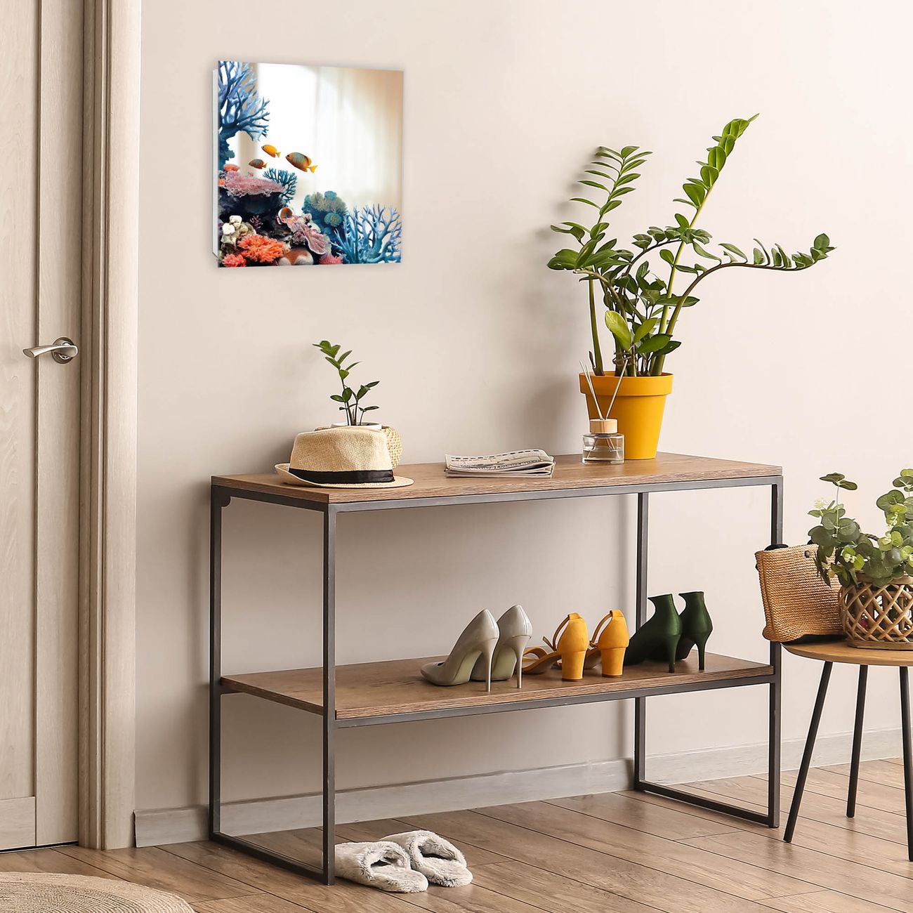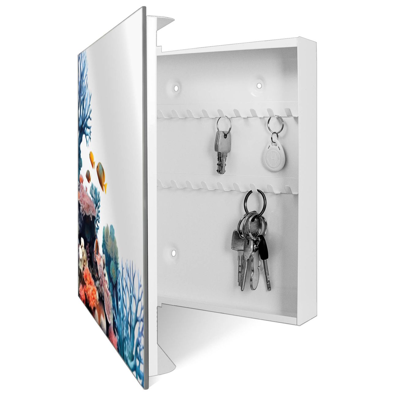Bringe Ordnung und Stil in deinen Eingangsbereich mit dem banjado Schlüsselkasten mit Spiegel. Die elegante Spiegelfront kombiniert Funktionalität mit modernem Design und macht die Schlüsselaufbewahrung zu einem dekorativen Highlight. ✅ Spiegel Schlüsselaufbewahrung mit Motiv Motiv Korallenriff und Fische Der Design-Schlüsselkasten Motiv Motiv Korallenriff und Fische bietet Platz für bis zu 50 Schlüssel, die auf 5 stabilen Reihen mit je 10 Haken übersichtlich verstaut werden. Mit seinen kompakten Maßen von 30 x 30 x 5 cm passt die Schlüsselbox perfekt auch in kleinere Räume. Der weiß lackierte Stahlkorpus mit rechts angeschlagenem Türscharnier harmoniert mit der Spiegelfront und fügt sich nahtlos in jedes Wohnambiente ein. Ob als Schlüsselorganizer für Zuhause oder als praktische Lösung für Büros, Praxen und Gewerbe, der banjado Schlüsselkasten sorgt für Ordnung und Übersicht. Die Spiegelfront verleiht dem Eingangsbereich zusätzliche Funktionalität und lässt Räume optisch größer wirken. Die Schlüsselbox Motiv Motiv Korallenriff und Fische zur Wandmontage wird inklusive Befestigungsmaterial geliefert und ist schnell angebracht. So hast du deine Schlüssel jederzeit griffbereit und zugleich stilvoll verstaut. Mit diesem banjado Schlüsselkasten Motiv Motiv Korallenriff und Fische kombinierst du praktische Aufbewahrung mit stilvollem Wohndesign. Ob privat oder geschäftlich, die Schlüsselbox sorgt für mehr Ordnung, Übersicht und ein wohnliches Ambiente.Vorteile im Überblick