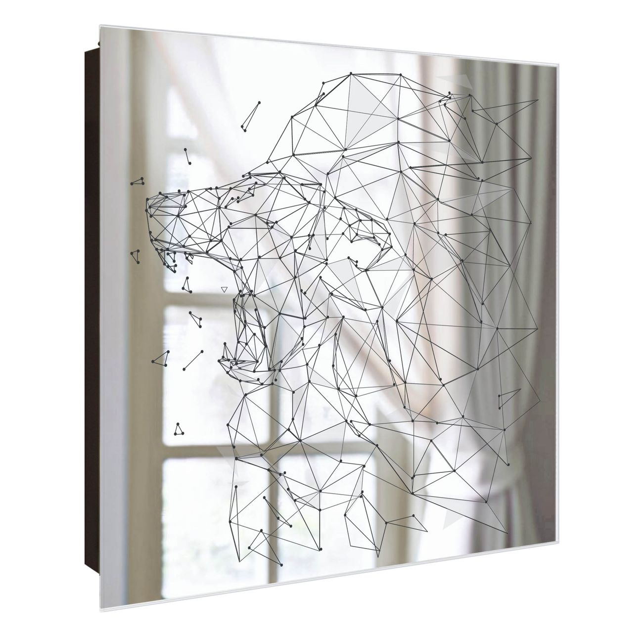 Bringe Ordnung und Stil in deinen Eingangsbereich mit dem banjado Schlüsselkasten mit Spiegel. Die elegante Spiegelfront kombiniert Funktionalität mit modernem Design und macht die Schlüsselaufbewahrung zu einem dekorativen Highlight. ✅ Spiegel Schlüsselaufbewahrung mit Motiv Motiv Löwe abstrakt 2 Der Design-Schlüsselkasten Motiv Motiv Löwe abstrakt 2 bietet Platz für bis zu 50 Schlüssel, die auf 5 stabilen Reihen mit je 10 Haken übersichtlich verstaut werden. Mit seinen kompakten Maßen von 30 x 30 x 5 cm passt die Schlüsselbox perfekt auch in kleinere Räume. Der schwarz lackierte Stahlkorpus mit rechts angeschlagenem Türscharnier harmoniert mit der Spiegelfront und fügt sich nahtlos in jedes Wohnambiente ein. Ob als Schlüsselorganizer für Zuhause oder als praktische Lösung für Büros, Praxen und Gewerbe, der banjado Schlüsselkasten sorgt für Ordnung und Übersicht. Die Spiegelfront verleiht dem Eingangsbereich zusätzliche Funktionalität und lässt Räume optisch größer wirken. Die Schlüsselbox Motiv Motiv Löwe abstrakt 2 zur Wandmontage wird inklusive Befestigungsmaterial geliefert und ist schnell angebracht. So hast du deine Schlüssel jederzeit griffbereit und zugleich stilvoll verstaut. Mit diesem banjado Schlüsselkasten Motiv Motiv Löwe abstrakt 2 kombinierst du praktische Aufbewahrung mit stilvollem Wohndesign. Ob privat oder geschäftlich, die Schlüsselbox sorgt für mehr Ordnung, Übersicht und ein wohnliches Ambiente.Vorteile im Überblick