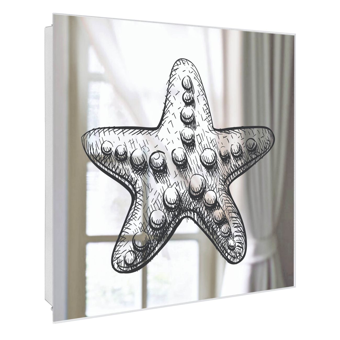 Bringe Ordnung und Stil in deinen Eingangsbereich mit dem banjado Schlüsselkasten mit Spiegel. Die elegante Spiegelfront kombiniert Funktionalität mit modernem Design und macht die Schlüsselaufbewahrung zu einem dekorativen Highlight. ✅ Spiegel Schlüsselaufbewahrung mit Motiv Motiv Muschel 8 Der Design-Schlüsselkasten Motiv Motiv Muschel 8 bietet Platz für bis zu 50 Schlüssel, die auf 5 stabilen Reihen mit je 10 Haken übersichtlich verstaut werden. Mit seinen kompakten Maßen von 30 x 30 x 5 cm passt die Schlüsselbox perfekt auch in kleinere Räume. Der weiß lackierte Stahlkorpus mit rechts angeschlagenem Türscharnier harmoniert mit der Spiegelfront und fügt sich nahtlos in jedes Wohnambiente ein. Ob als Schlüsselorganizer für Zuhause oder als praktische Lösung für Büros, Praxen und Gewerbe, der banjado Schlüsselkasten sorgt für Ordnung und Übersicht. Die Spiegelfront verleiht dem Eingangsbereich zusätzliche Funktionalität und lässt Räume optisch größer wirken. Die Schlüsselbox Motiv Motiv Muschel 8 zur Wandmontage wird inklusive Befestigungsmaterial geliefert und ist schnell angebracht. So hast du deine Schlüssel jederzeit griffbereit und zugleich stilvoll verstaut. Mit diesem banjado Schlüsselkasten Motiv Motiv Muschel 8 kombinierst du praktische Aufbewahrung mit stilvollem Wohndesign. Ob privat oder geschäftlich, die Schlüsselbox sorgt für mehr Ordnung, Übersicht und ein wohnliches Ambiente.Vorteile im Überblick