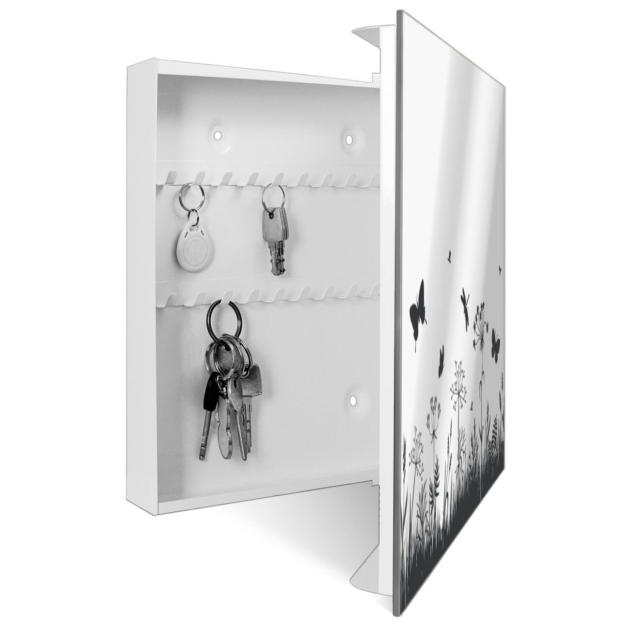 Bringe Ordnung und Stil in deinen Eingangsbereich mit dem banjado Schlüsselkasten mit Spiegel. Die elegante Spiegelfront kombiniert Funktionalität mit modernem Design und macht die Schlüsselaufbewahrung zu einem dekorativen Highlight. ✅ Spiegel Schlüsselaufbewahrung mit Motiv Motiv Sommerwiese Silhouette Der Design-Schlüsselkasten Motiv Motiv Sommerwiese Silhouette bietet Platz für bis zu 50 Schlüssel, die auf 5 stabilen Reihen mit je 10 Haken übersichtlich verstaut werden. Mit seinen kompakten Maßen von 30 x 30 x 5 cm passt die Schlüsselbox perfekt auch in kleinere Räume. Der weiß lackierte Stahlkorpus mit rechts angeschlagenem Türscharnier harmoniert mit der Spiegelfront und fügt sich nahtlos in jedes Wohnambiente ein. Ob als Schlüsselorganizer für Zuhause oder als praktische Lösung für Büros, Praxen und Gewerbe, der banjado Schlüsselkasten sorgt für Ordnung und Übersicht. Die Spiegelfront verleiht dem Eingangsbereich zusätzliche Funktionalität und lässt Räume optisch größer wirken. Die Schlüsselbox Motiv Motiv Sommerwiese Silhouette zur Wandmontage wird inklusive Befestigungsmaterial geliefert und ist schnell angebracht. So hast du deine Schlüssel jederzeit griffbereit und zugleich stilvoll verstaut. Mit diesem banjado Schlüsselkasten Motiv Motiv Sommerwiese Silhouette kombinierst du praktische Aufbewahrung mit stilvollem Wohndesign. Ob privat oder geschäftlich, die Schlüsselbox sorgt für mehr Ordnung, Übersicht und ein wohnliches Ambiente.Vorteile im Überblick