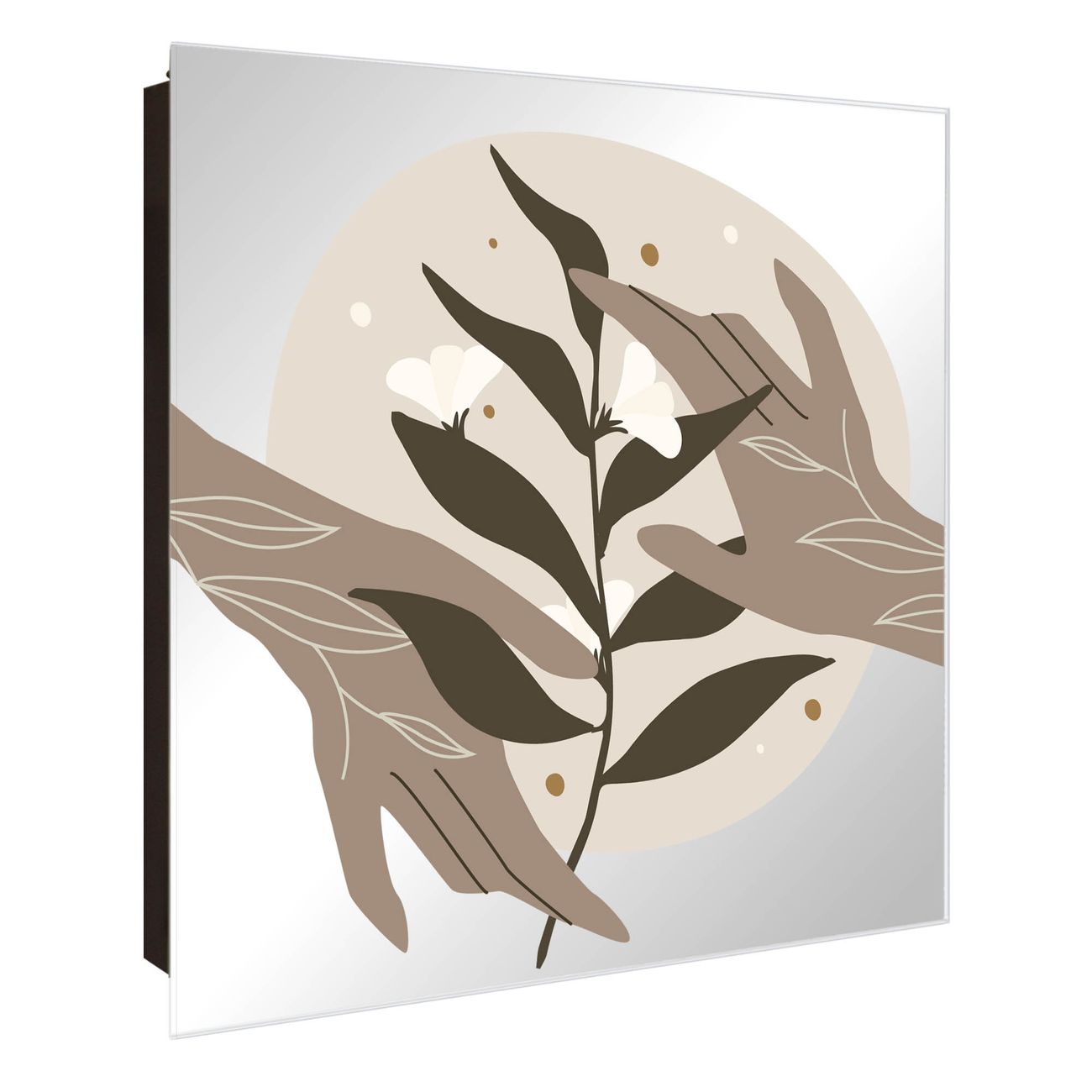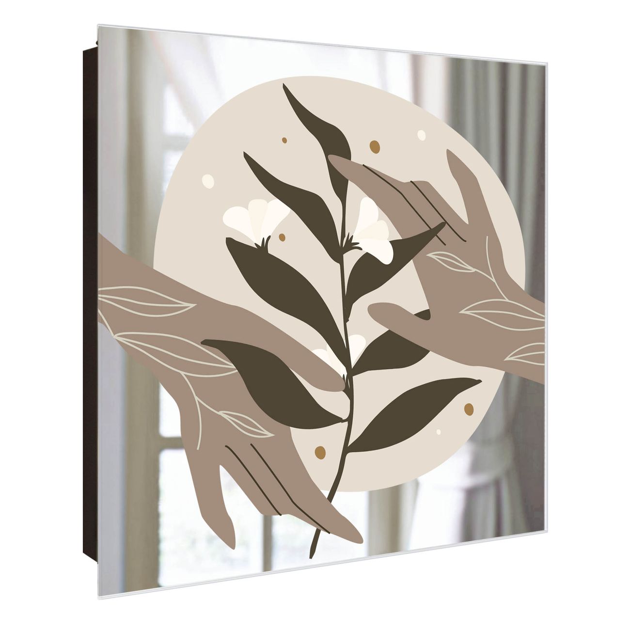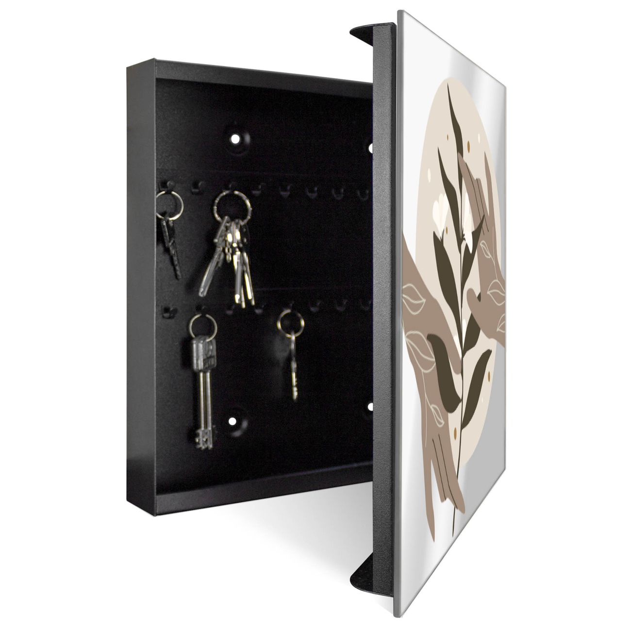 Bringe Ordnung und Stil in deinen Eingangsbereich mit dem banjado Schlüsselkasten mit Spiegel. Die elegante Spiegelfront kombiniert Funktionalität mit modernem Design und macht die Schlüsselaufbewahrung zu einem dekorativen Highlight. ✅ Spiegel Schlüsselaufbewahrung mit Motiv Motiv Zarte Berührung Der Design-Schlüsselkasten Motiv Motiv Zarte Berührung bietet Platz für bis zu 50 Schlüssel, die auf 5 stabilen Reihen mit je 10 Haken übersichtlich verstaut werden. Mit seinen kompakten Maßen von 30 x 30 x 5 cm passt die Schlüsselbox perfekt auch in kleinere Räume. Der schwarz lackierte Stahlkorpus mit rechts angeschlagenem Türscharnier harmoniert mit der Spiegelfront und fügt sich nahtlos in jedes Wohnambiente ein. Ob als Schlüsselorganizer für Zuhause oder als praktische Lösung für Büros, Praxen und Gewerbe, der banjado Schlüsselkasten sorgt für Ordnung und Übersicht. Die Spiegelfront verleiht dem Eingangsbereich zusätzliche Funktionalität und lässt Räume optisch größer wirken. Die Schlüsselbox Motiv Motiv Zarte Berührung zur Wandmontage wird inklusive Befestigungsmaterial geliefert und ist schnell angebracht. So hast du deine Schlüssel jederzeit griffbereit und zugleich stilvoll verstaut. Mit diesem banjado Schlüsselkasten Motiv Motiv Zarte Berührung kombinierst du praktische Aufbewahrung mit stilvollem Wohndesign. Ob privat oder geschäftlich, die Schlüsselbox sorgt für mehr Ordnung, Übersicht und ein wohnliches Ambiente.Vorteile im Überblick