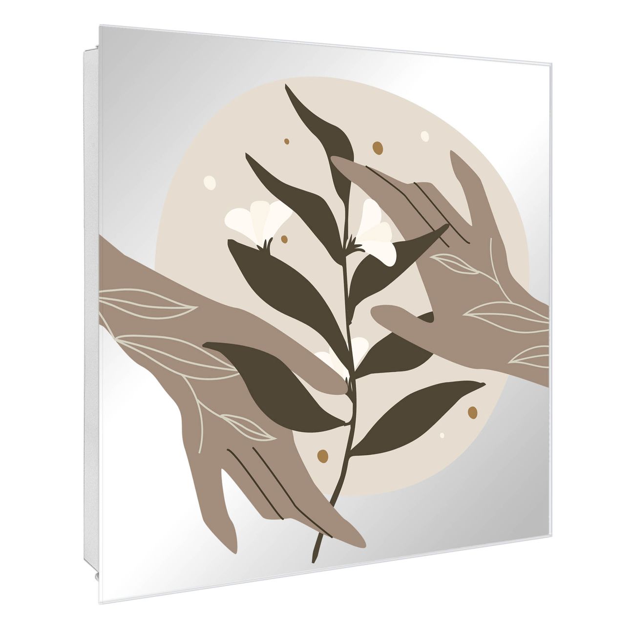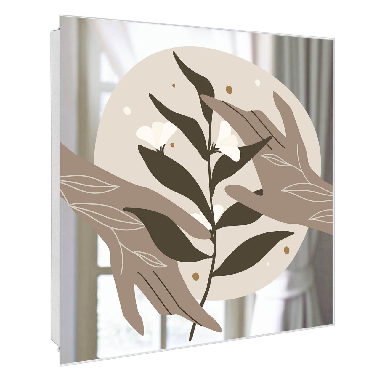 Bringe Ordnung und Stil in deinen Eingangsbereich mit dem banjado Schlüsselkasten mit Spiegel. Die elegante Spiegelfront kombiniert Funktionalität mit modernem Design und macht die Schlüsselaufbewahrung zu einem dekorativen Highlight. ✅ Spiegel Schlüsselaufbewahrung mit Motiv Motiv Zarte Berührung Der Design-Schlüsselkasten Motiv Motiv Zarte Berührung bietet Platz für bis zu 50 Schlüssel, die auf 5 stabilen Reihen mit je 10 Haken übersichtlich verstaut werden. Mit seinen kompakten Maßen von 30 x 30 x 5 cm passt die Schlüsselbox perfekt auch in kleinere Räume. Der weiß lackierte Stahlkorpus mit rechts angeschlagenem Türscharnier harmoniert mit der Spiegelfront und fügt sich nahtlos in jedes Wohnambiente ein. Ob als Schlüsselorganizer für Zuhause oder als praktische Lösung für Büros, Praxen und Gewerbe, der banjado Schlüsselkasten sorgt für Ordnung und Übersicht. Die Spiegelfront verleiht dem Eingangsbereich zusätzliche Funktionalität und lässt Räume optisch größer wirken. Die Schlüsselbox Motiv Motiv Zarte Berührung zur Wandmontage wird inklusive Befestigungsmaterial geliefert und ist schnell angebracht. So hast du deine Schlüssel jederzeit griffbereit und zugleich stilvoll verstaut. Mit diesem banjado Schlüsselkasten Motiv Motiv Zarte Berührung kombinierst du praktische Aufbewahrung mit stilvollem Wohndesign. Ob privat oder geschäftlich, die Schlüsselbox sorgt für mehr Ordnung, Übersicht und ein wohnliches Ambiente.Vorteile im Überblick