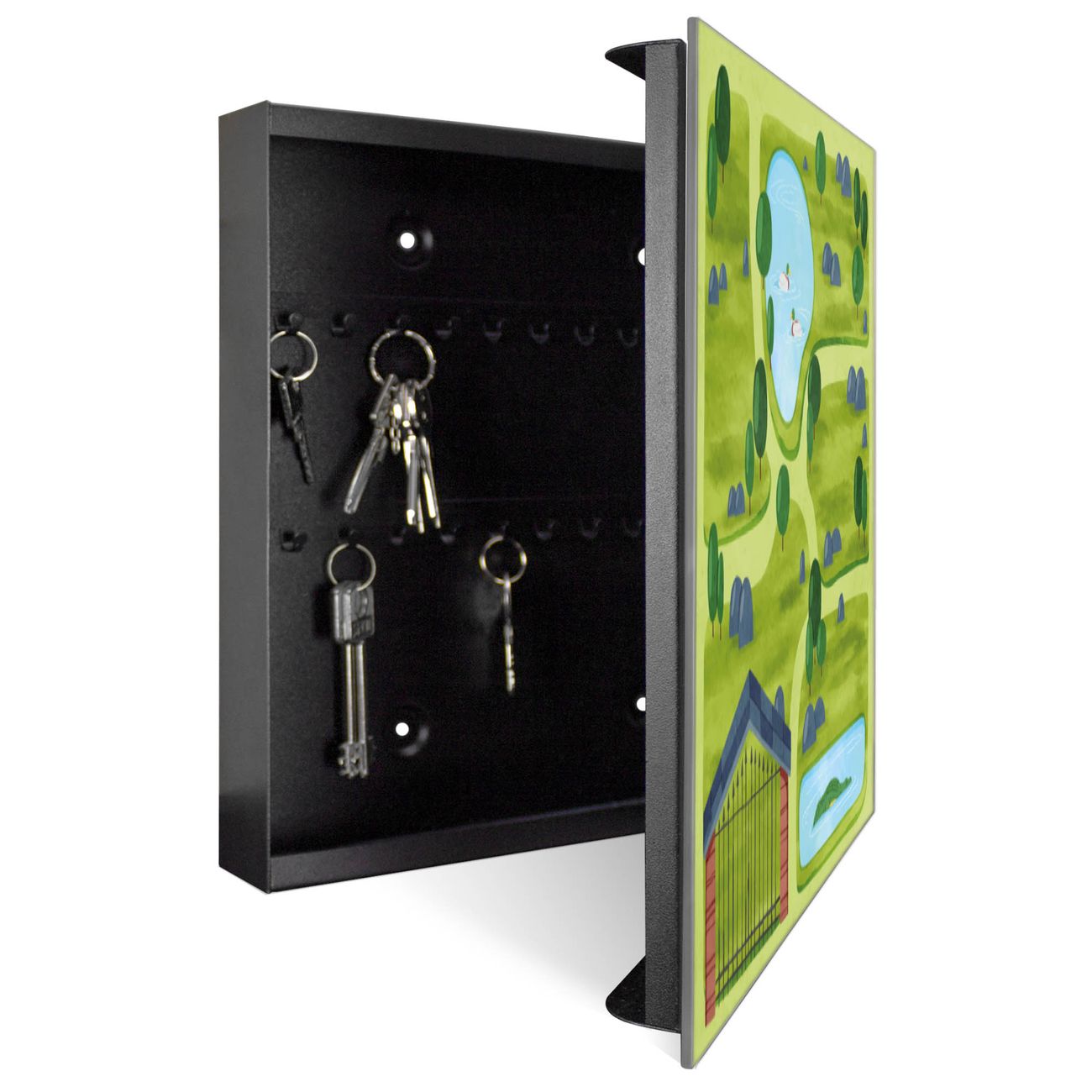 Bringe Ordnung und Stil in deinen Eingangsbereich mit dem banjado Schlüsselkasten mit Spiegel. Die elegante Spiegelfront kombiniert Funktionalität mit modernem Design und macht die Schlüsselaufbewahrung zu einem dekorativen Highlight. ✅ Spiegel Schlüsselaufbewahrung mit Motiv Motiv Zoofläche Der Design-Schlüsselkasten Motiv Motiv Zoofläche bietet Platz für bis zu 50 Schlüssel, die auf 5 stabilen Reihen mit je 10 Haken übersichtlich verstaut werden. Mit seinen kompakten Maßen von 30 x 30 x 5 cm passt die Schlüsselbox perfekt auch in kleinere Räume. Der schwarz lackierte Stahlkorpus mit rechts angeschlagenem Türscharnier harmoniert mit der Spiegelfront und fügt sich nahtlos in jedes Wohnambiente ein. Ob als Schlüsselorganizer für Zuhause oder als praktische Lösung für Büros, Praxen und Gewerbe, der banjado Schlüsselkasten sorgt für Ordnung und Übersicht. Die Spiegelfront verleiht dem Eingangsbereich zusätzliche Funktionalität und lässt Räume optisch größer wirken. Die Schlüsselbox Motiv Motiv Zoofläche zur Wandmontage wird inklusive Befestigungsmaterial geliefert und ist schnell angebracht. So hast du deine Schlüssel jederzeit griffbereit und zugleich stilvoll verstaut. Mit diesem banjado Schlüsselkasten Motiv Motiv Zoofläche kombinierst du praktische Aufbewahrung mit stilvollem Wohndesign. Ob privat oder geschäftlich, die Schlüsselbox sorgt für mehr Ordnung, Übersicht und ein wohnliches Ambiente.Vorteile im Überblick