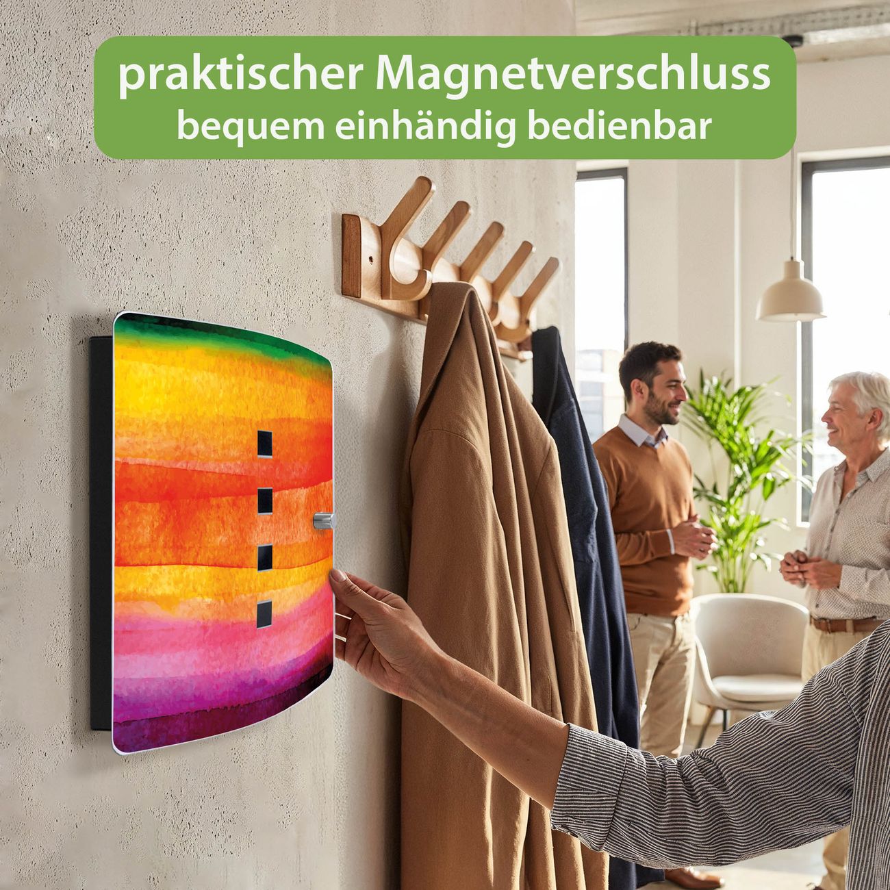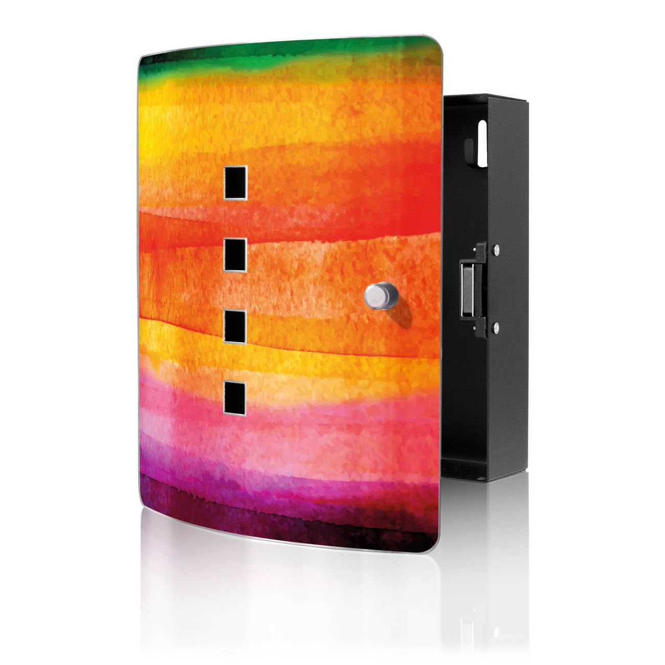 Funktion / Nutzen: Die leicht geschwungene Edelstahltür ist mit einer hochwertigen Motivfolie und dem Motiv Motiv Aquarell kaschiert. Ein praktischer Magnetverschluss ermöglicht Ihnen ein schnelles Öffnen und Schließen. Befestigt wird der Schlüsselkasten an 2 Stellen auf der Rückseite, passendes Montagematerial fügen wir bereits bei.