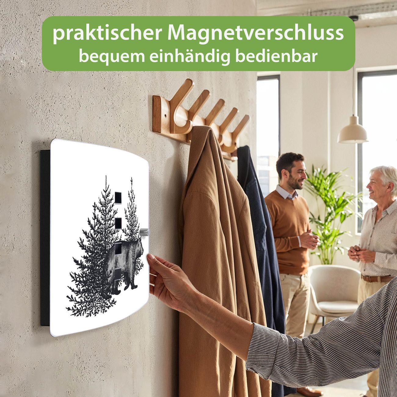 Funktion / Nutzen: Die leicht geschwungene Edelstahltür ist mit einer hochwertigen Motivfolie und dem Motiv Motiv Bär in Schwarz-Weiß kaschiert. Ein praktischer Magnetverschluss ermöglicht Ihnen ein schnelles Öffnen und Schließen. Befestigt wird der Schlüsselkasten an 2 Stellen auf der Rückseite, passendes Montagematerial fügen wir bereits bei.