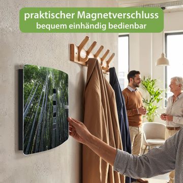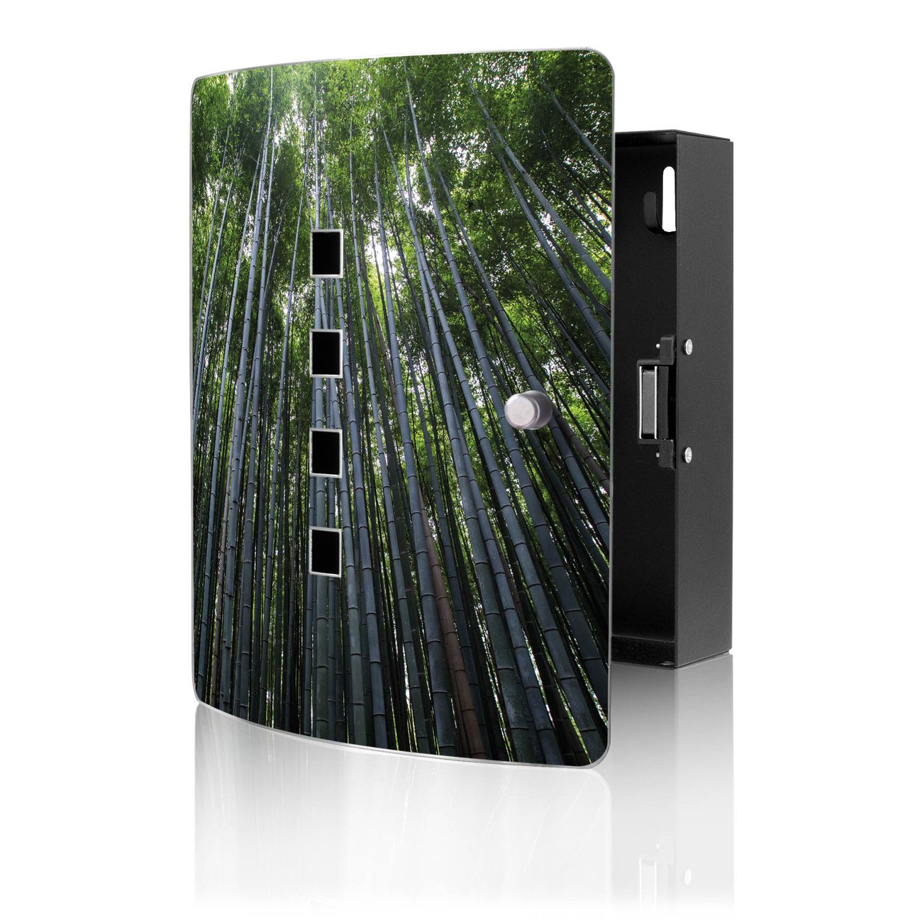 Funktion / Nutzen: Die leicht geschwungene Edelstahltür ist mit einer hochwertigen Motivfolie und dem Motiv Motiv Bambuswald kaschiert. Ein praktischer Magnetverschluss ermöglicht Ihnen ein schnelles Öffnen und Schließen. Befestigt wird der Schlüsselkasten an 2 Stellen auf der Rückseite, passendes Montagematerial fügen wir bereits bei.