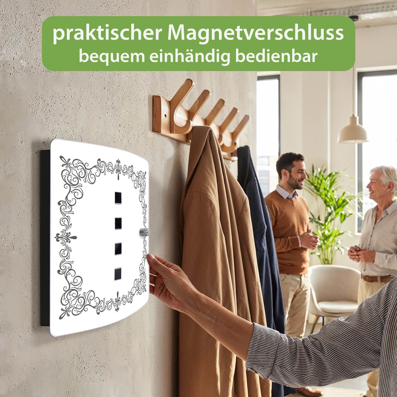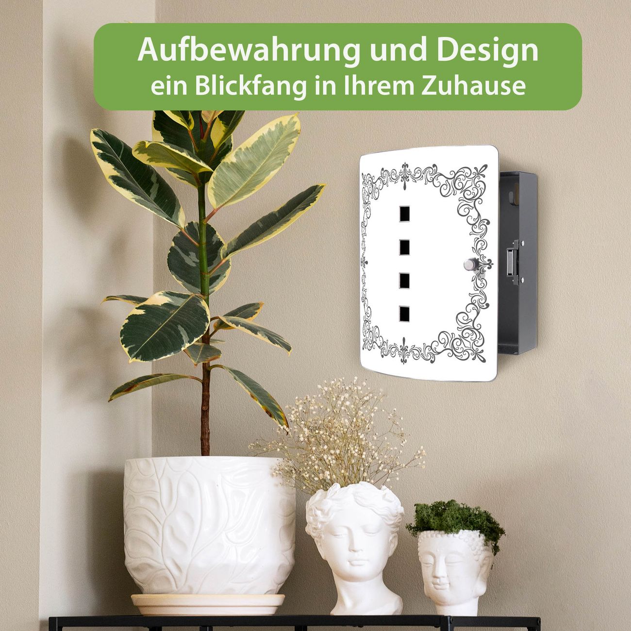 Funktion / Nutzen: Die leicht geschwungene Edelstahltür ist mit einer hochwertigen Motivfolie und dem Motiv Motiv Barockrahmen kaschiert. Ein praktischer Magnetverschluss ermöglicht Ihnen ein schnelles Öffnen und Schließen. Befestigt wird der Schlüsselkasten an 2 Stellen auf der Rückseite, passendes Montagematerial fügen wir bereits bei.