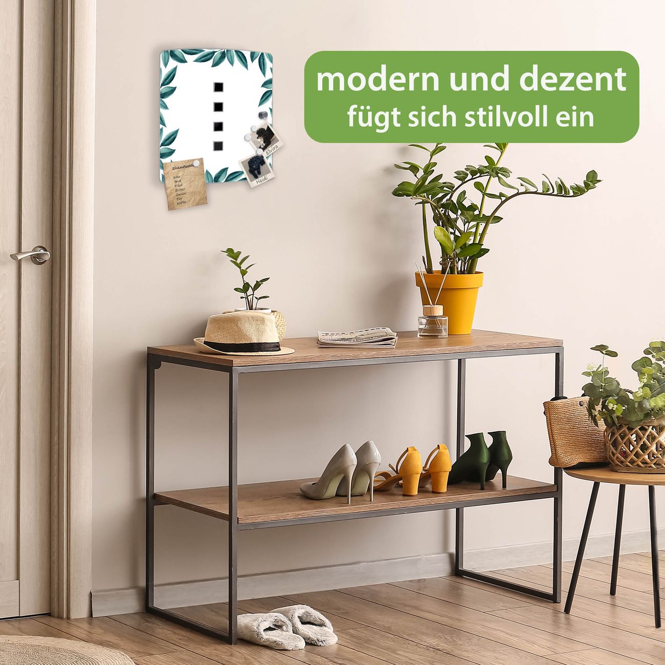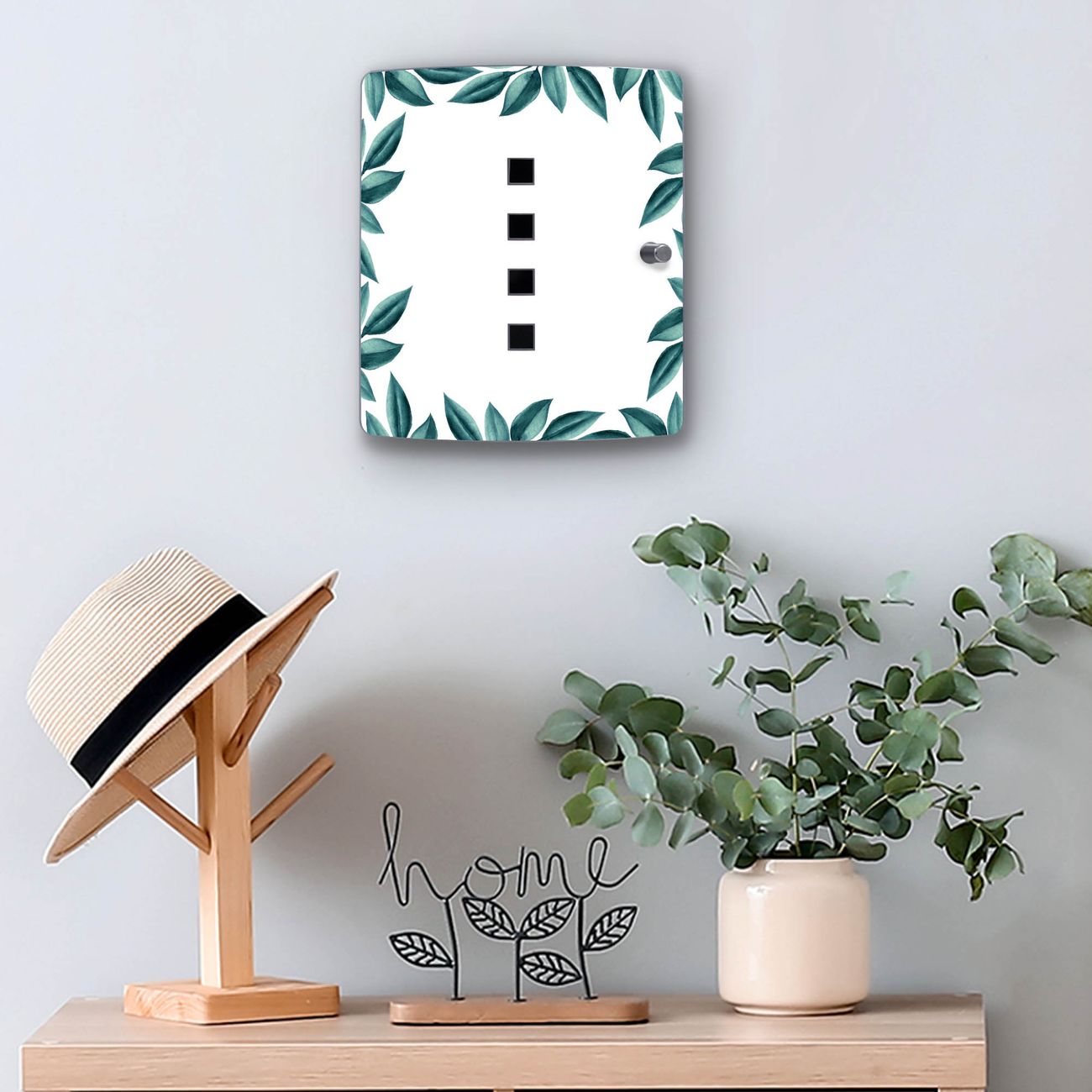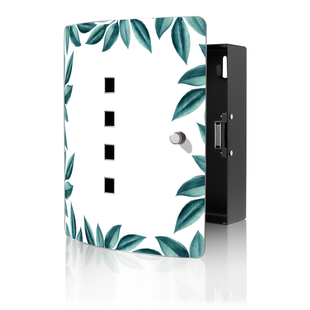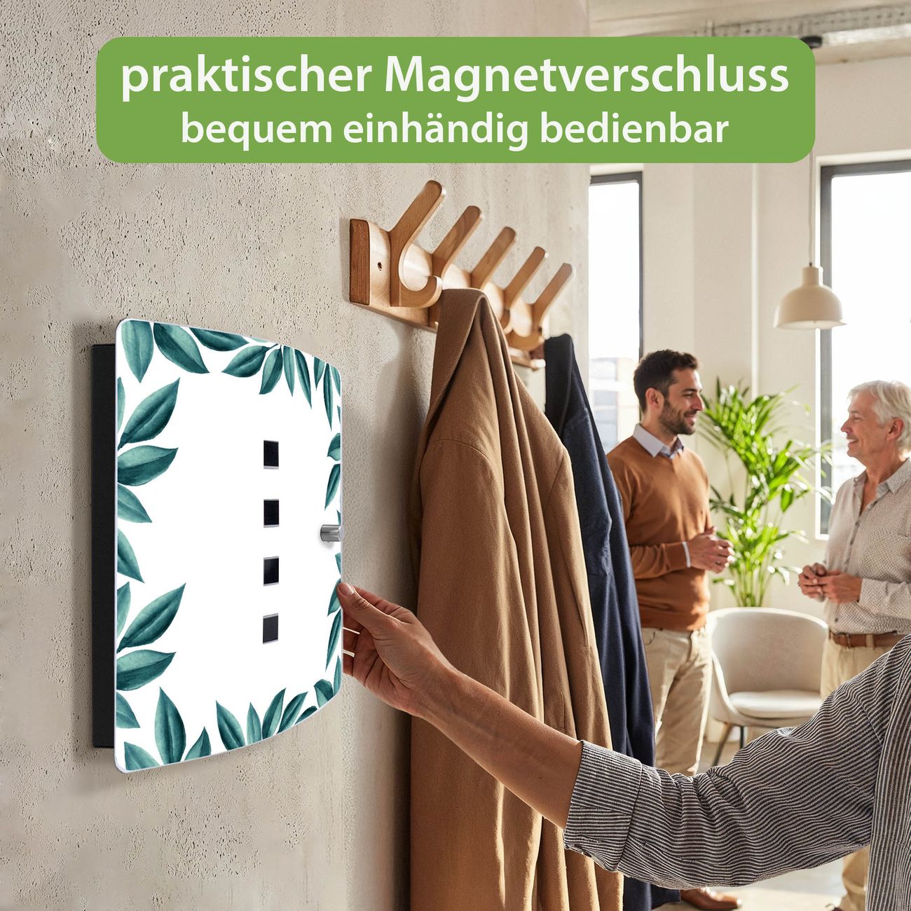 Funktion / Nutzen: Die leicht geschwungene Edelstahltür ist mit einer hochwertigen Motivfolie und dem Motiv Motiv Blätterrahmen kaschiert. Ein praktischer Magnetverschluss ermöglicht Ihnen ein schnelles Öffnen und Schließen. Befestigt wird der Schlüsselkasten an 2 Stellen auf der Rückseite, passendes Montagematerial fügen wir bereits bei.