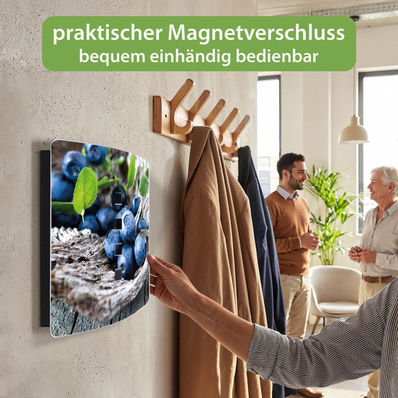 Funktion / Nutzen: Die leicht geschwungene Edelstahltür ist mit einer hochwertigen Motivfolie und dem Motiv Motiv Blaubeeren kaschiert. Ein praktischer Magnetverschluss ermöglicht Ihnen ein schnelles Öffnen und Schließen. Befestigt wird der Schlüsselkasten an 2 Stellen auf der Rückseite, passendes Montagematerial fügen wir bereits bei.