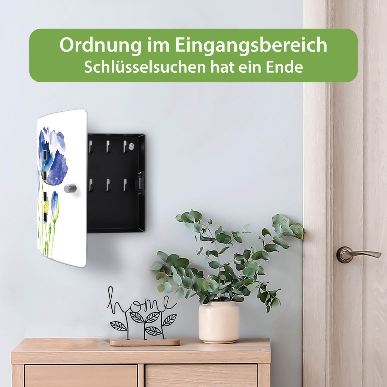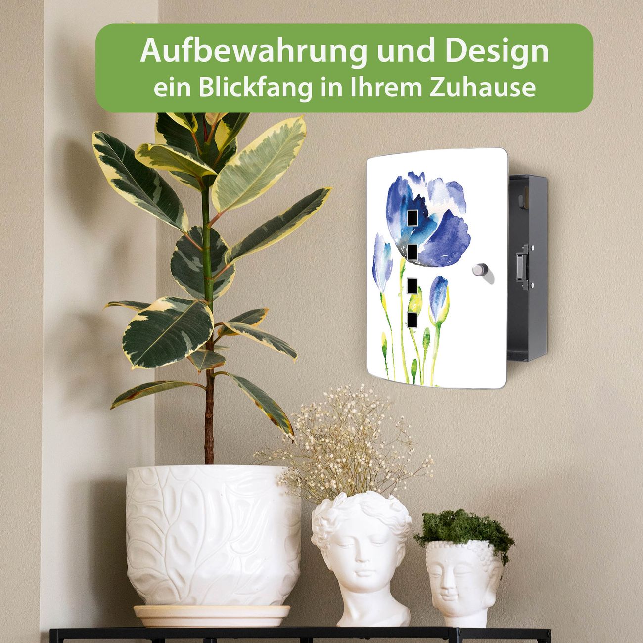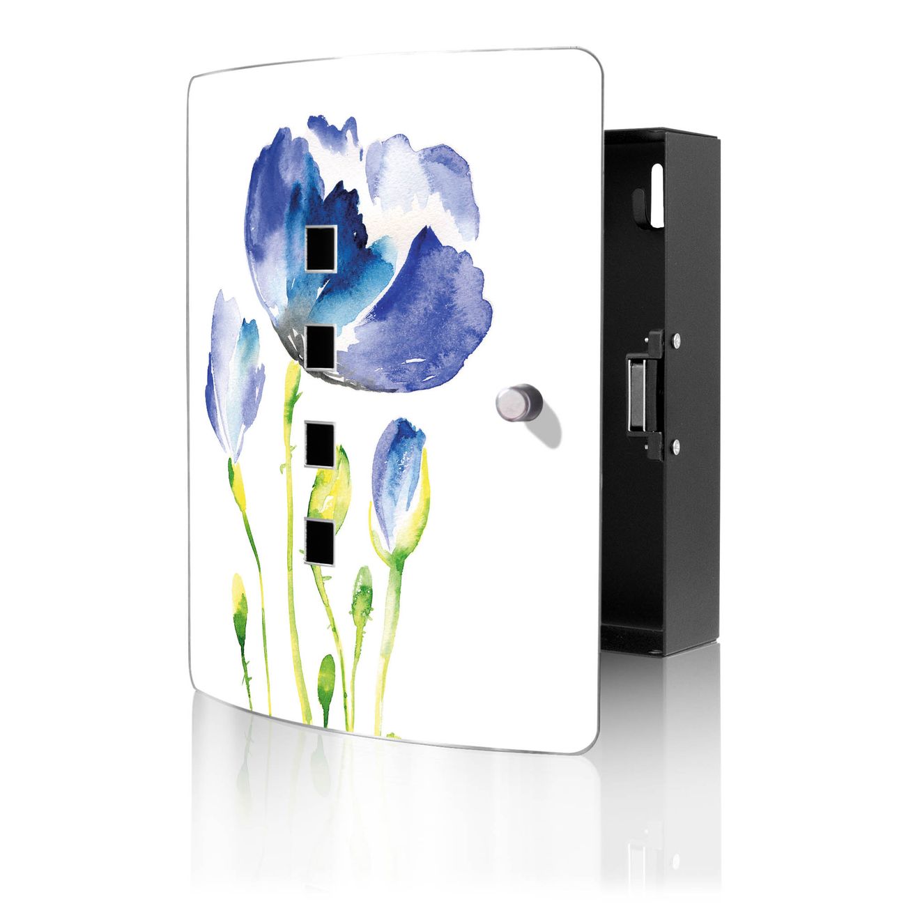 Funktion / Nutzen: Die leicht geschwungene Edelstahltür ist mit einer hochwertigen Motivfolie und dem Motiv Motiv Blauer Mohn kaschiert. Ein praktischer Magnetverschluss ermöglicht Ihnen ein schnelles Öffnen und Schließen. Befestigt wird der Schlüsselkasten an 2 Stellen auf der Rückseite, passendes Montagematerial fügen wir bereits bei.