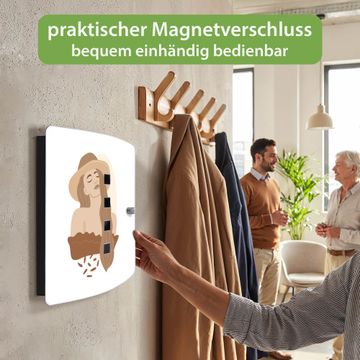 Funktion / Nutzen: Die leicht geschwungene Edelstahltür ist mit einer hochwertigen Motivfolie und dem Motiv Motiv Boho Frau kaschiert. Ein praktischer Magnetverschluss ermöglicht Ihnen ein schnelles Öffnen und Schließen. Befestigt wird der Schlüsselkasten an 2 Stellen auf der Rückseite, passendes Montagematerial fügen wir bereits bei.